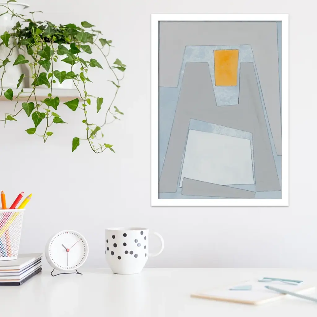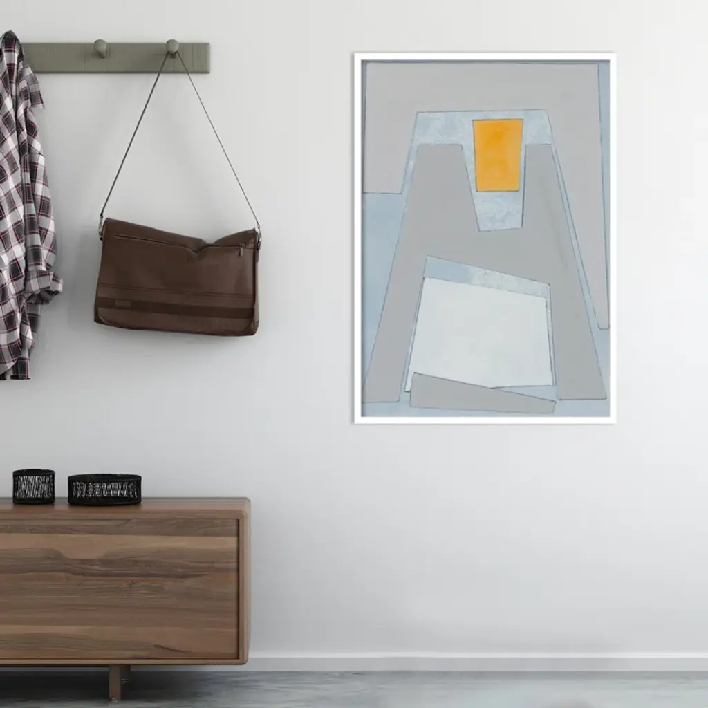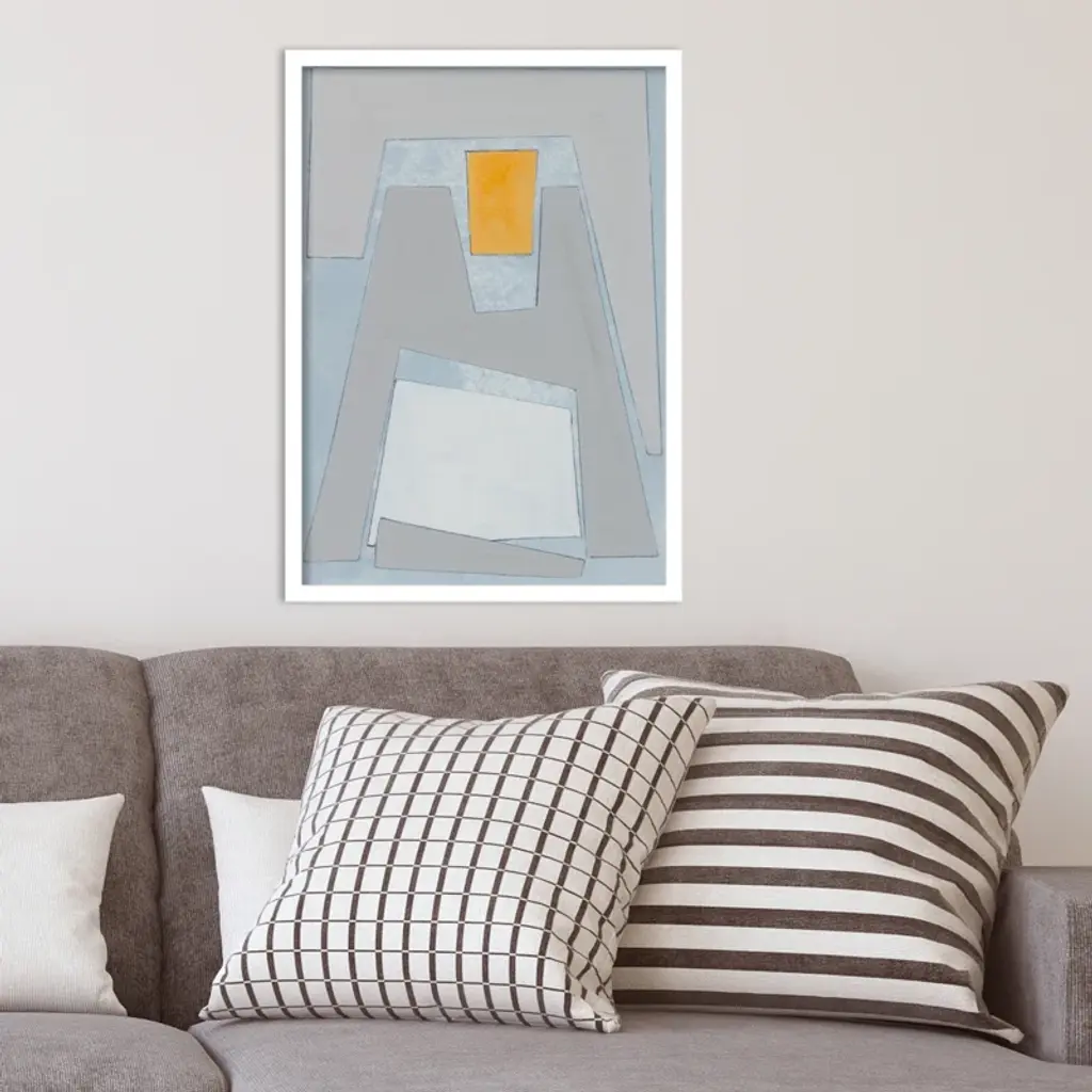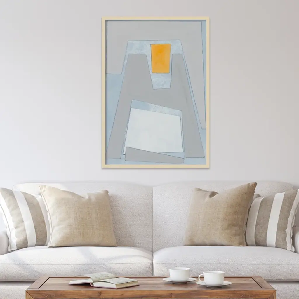 Defined by architectural elements abstracted into pure color + form, this print by artist Rob Delamater conjures an obscure + symbolically weighted sense of place – like a blueprint of a half-remembered dream. It’s giclee printed using fade-resistant inks + arrives ready to hang in a wooden frame.