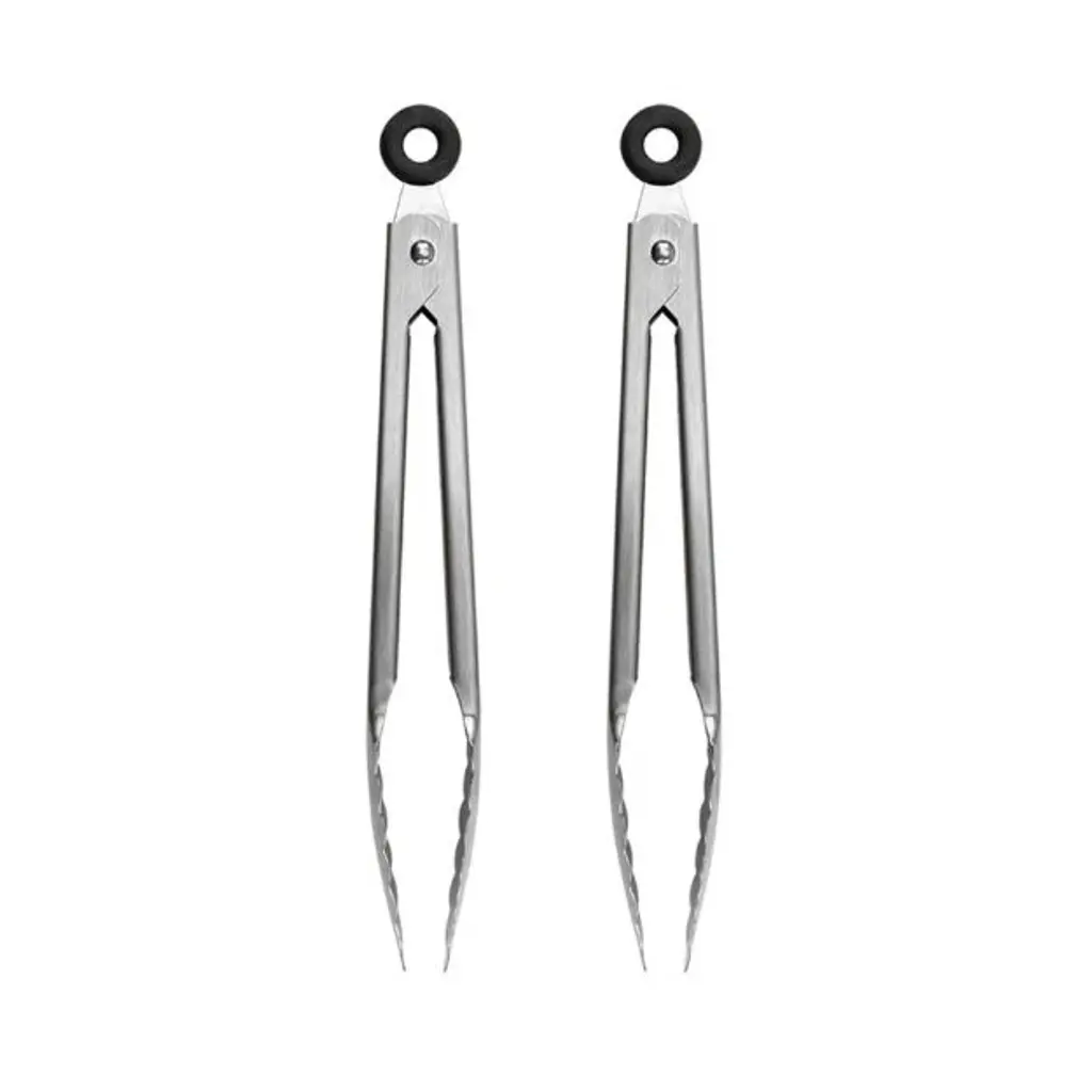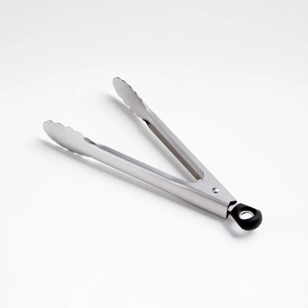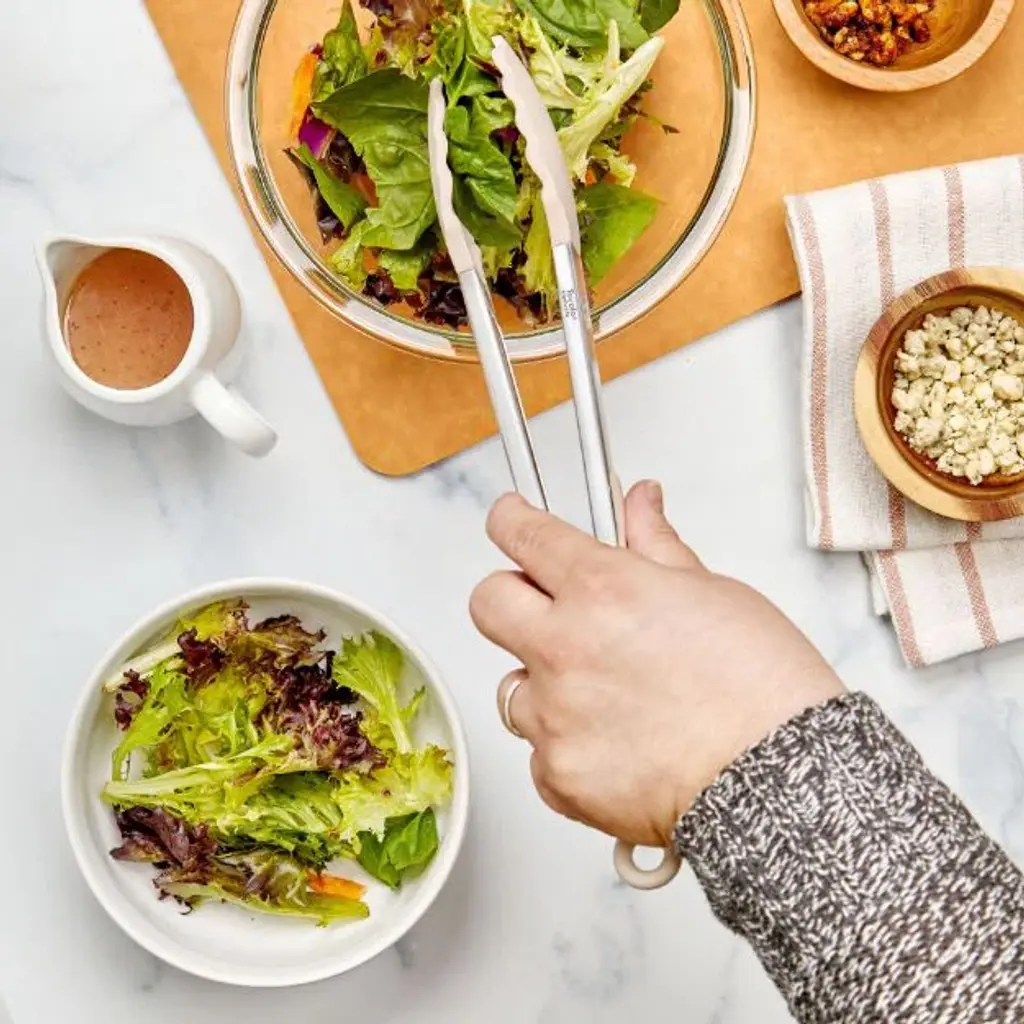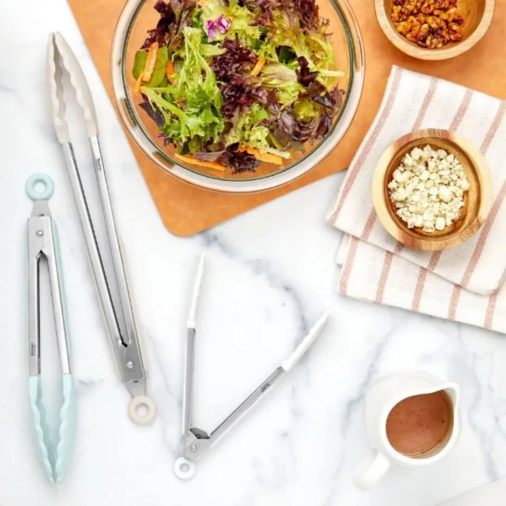 Flip, turn, and serve with the Stainless Steel Tongs With Silicone Grips! The silicone head provides an easy grip and is safe for non-stick pans. Stainless steel tongs are stain-resistant and food-safe to create the best possible kitchen tool. Stainless steel is heat resistant up to 600 degrees Fahrenheit, so it can withstand the stove, oven or grill. Non-slip silicone provides grip. Soft-touch silicone feels comfortable in hand and prevents accidental slips due to steaming foods or splatters of oil. The soft-touch silicone will not scratch cast iron or nonstick cookware. 9" overall length helps keep you a safe distance from heat, making them perfect for everyday use. Keep the tongs closed with the handy locking mechanism. Pull the ring to lock the tongs in the closed position and push it in to release the arms. Locking mechanism ensure that tongs fit neatly in drawers. BPA-free silicone tips are scratch-resistant, stain-resistant and food-safe to create the best possible kitchen tool. Silicone is heat resistant up to 600 degrees Fahrenheit, so it can withstand the stove, oven or grill. Made of steel and BPA-free silicone and nylon. Dishwasher safe.