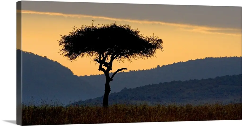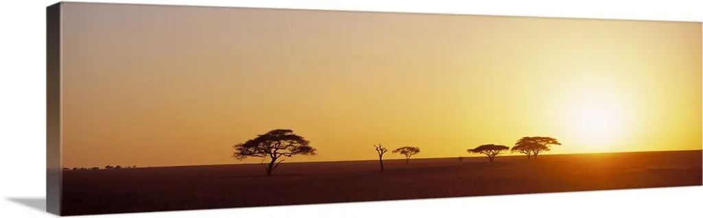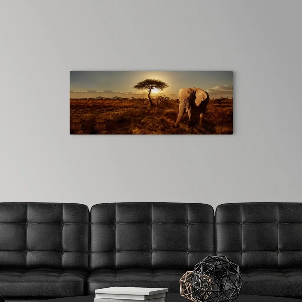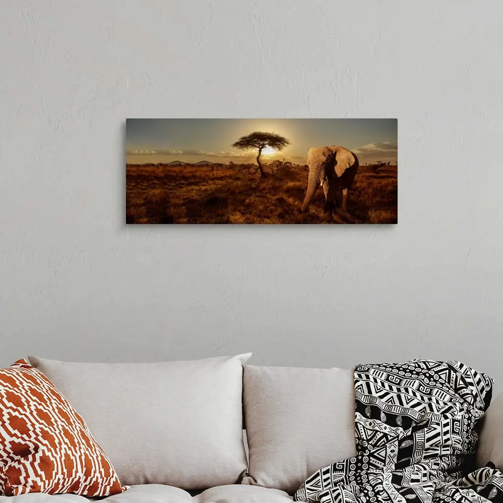 A panoramic photograph of an elephant walking near a tree in the savanna.