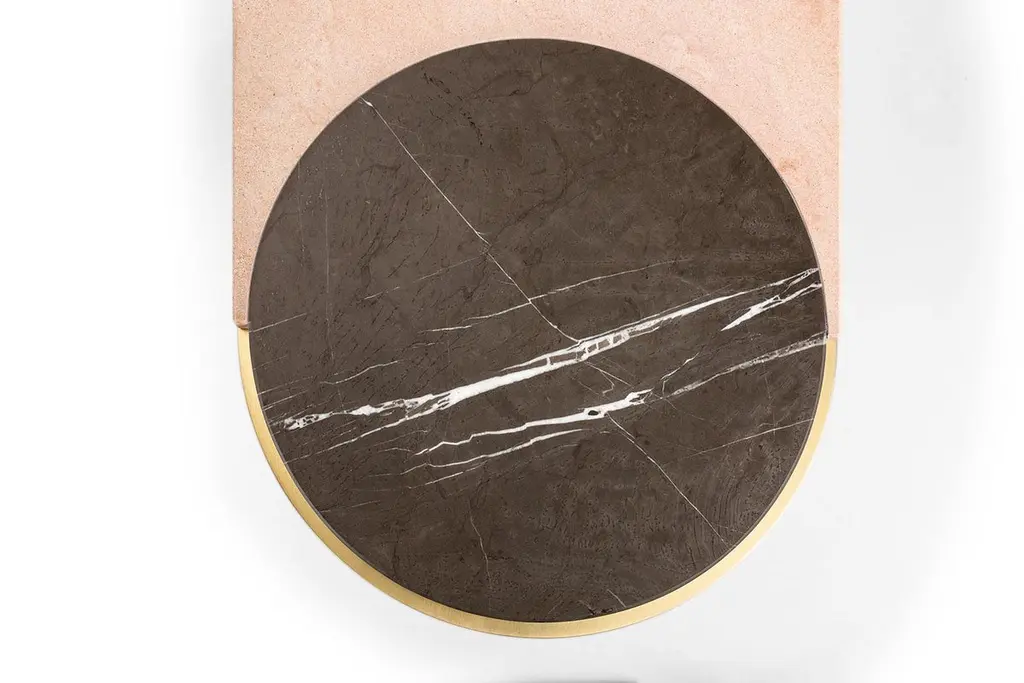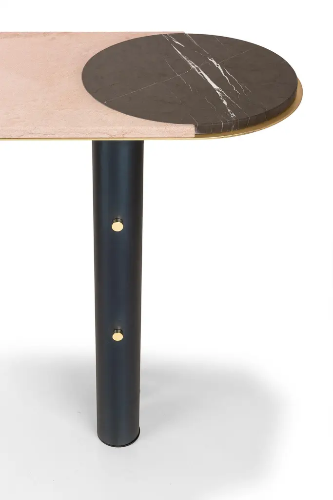 Elephant decorative furniture designed by Bernhardt-Vella for Mingardo. The Elephant console is made of geometric elements that assembled generate a product of unusual proportions. Strong yet refined, the shimmering blue galvanic finishing with brass reflections of the legs, and the pink and black marble of the top give the console a sophisticated yet informal look.
