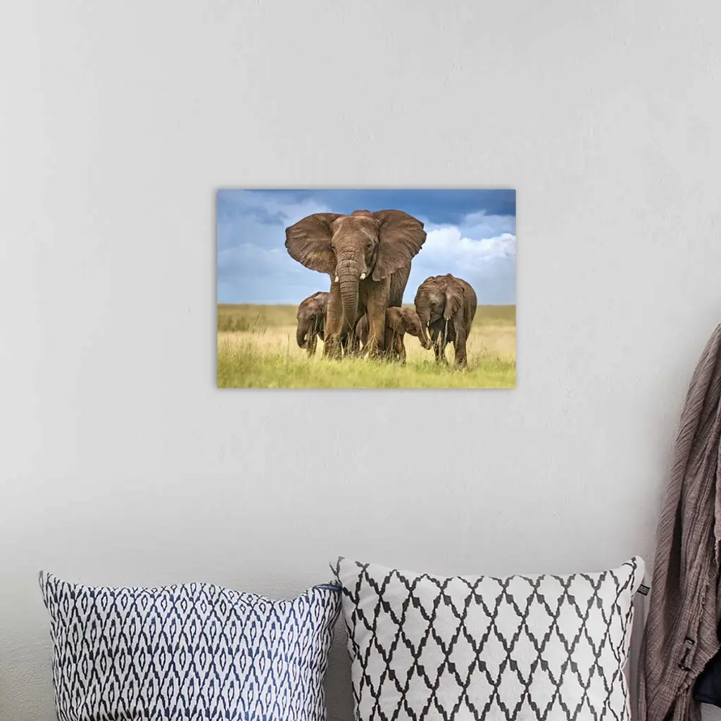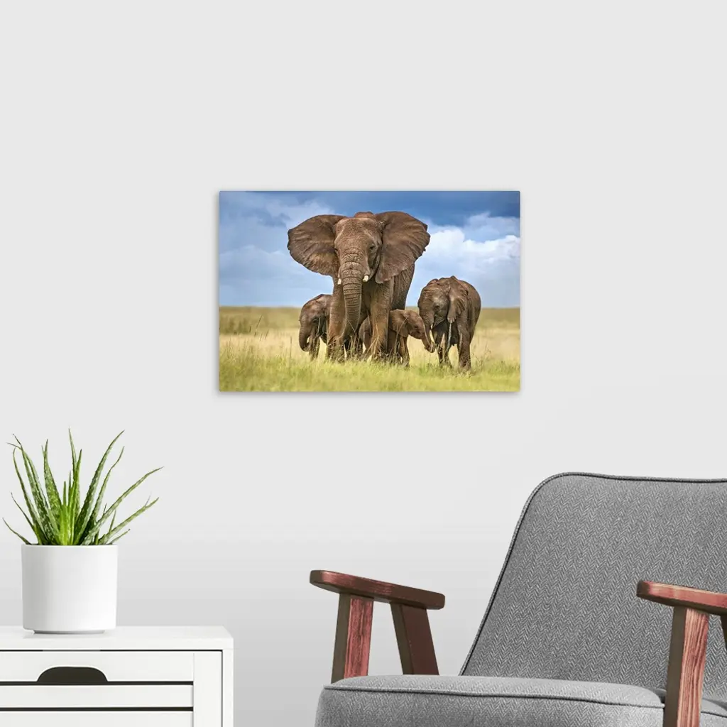 Elephant Mom Protecting Her Calves wall art for home and office decor. Discover canvas art prints, photos, mural, big canvas art and framed wall art in GreatBigCanvas.com's varied collections.