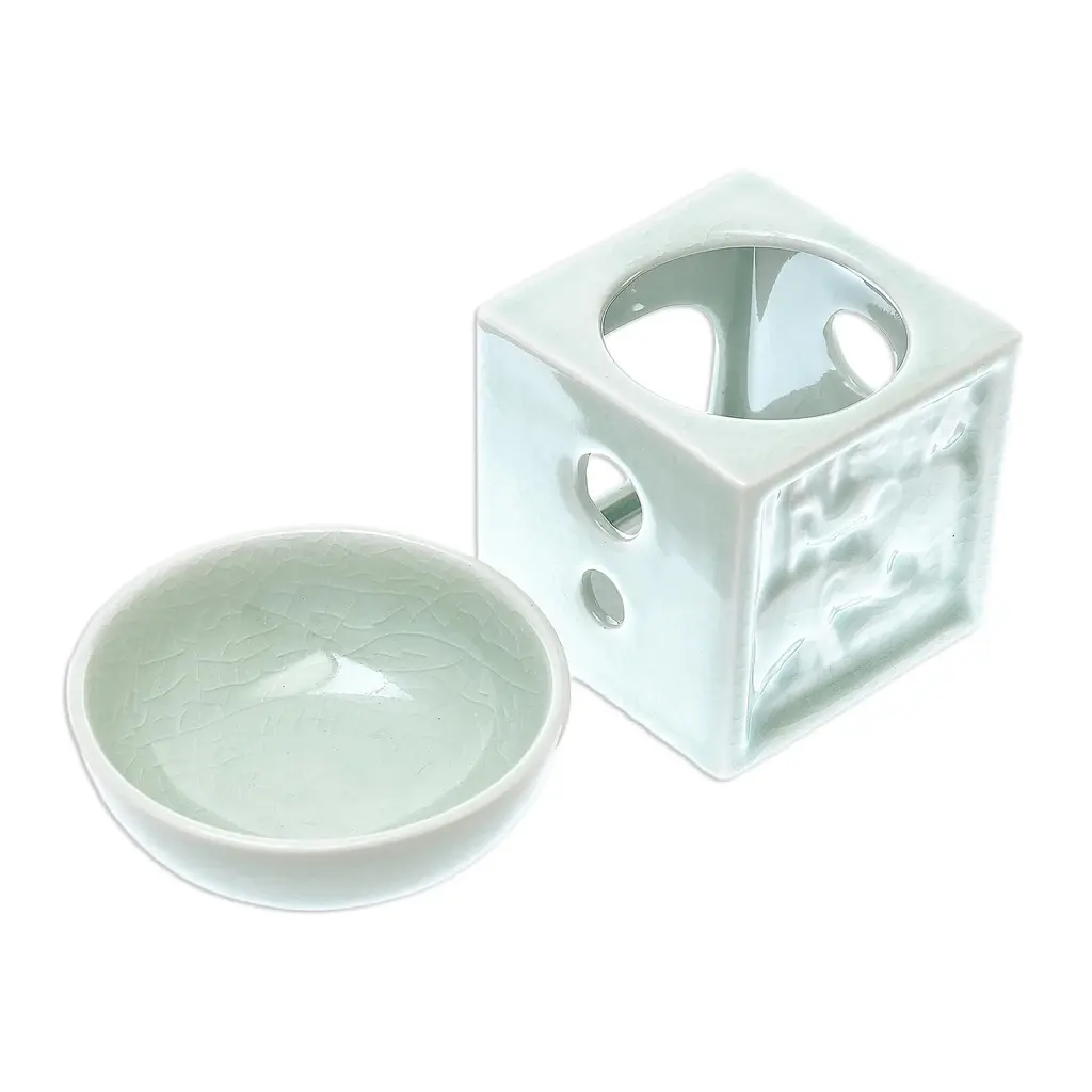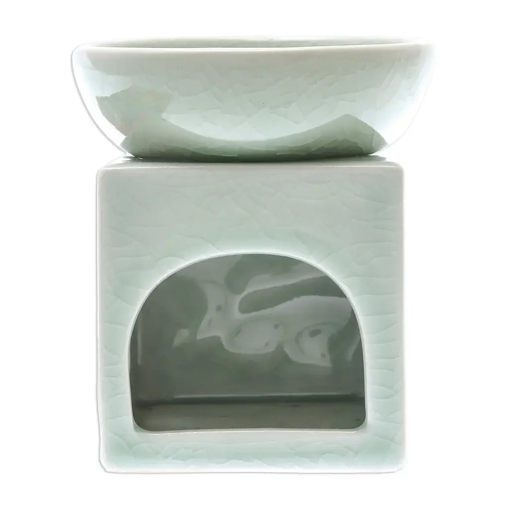 Crafted from ceramic, a small bowl rests atop a hollow cubic base, decorated with the image of two elephants in a jungle paradise on one side. Thai artisan Charoensri creates this incense warmer, given a crackled green celadon glaze.