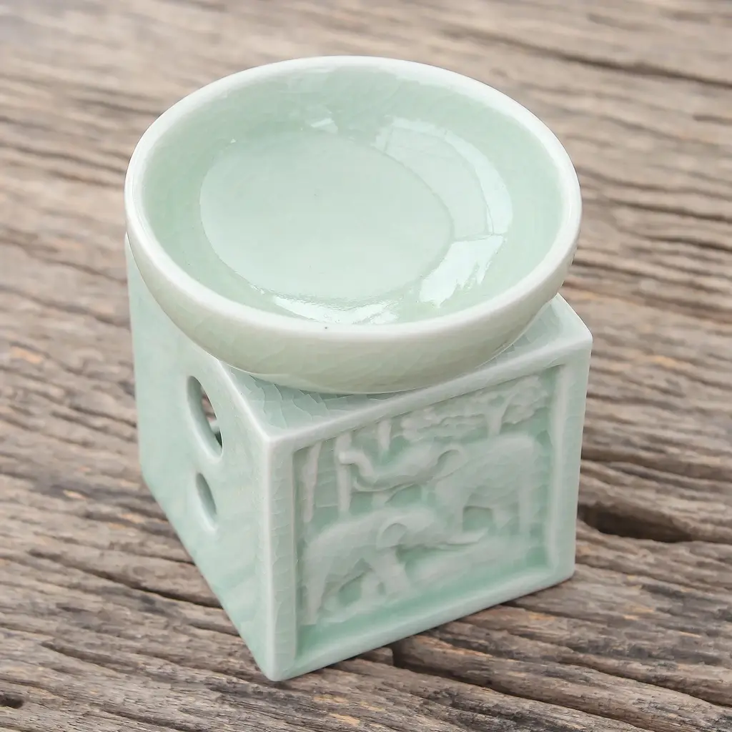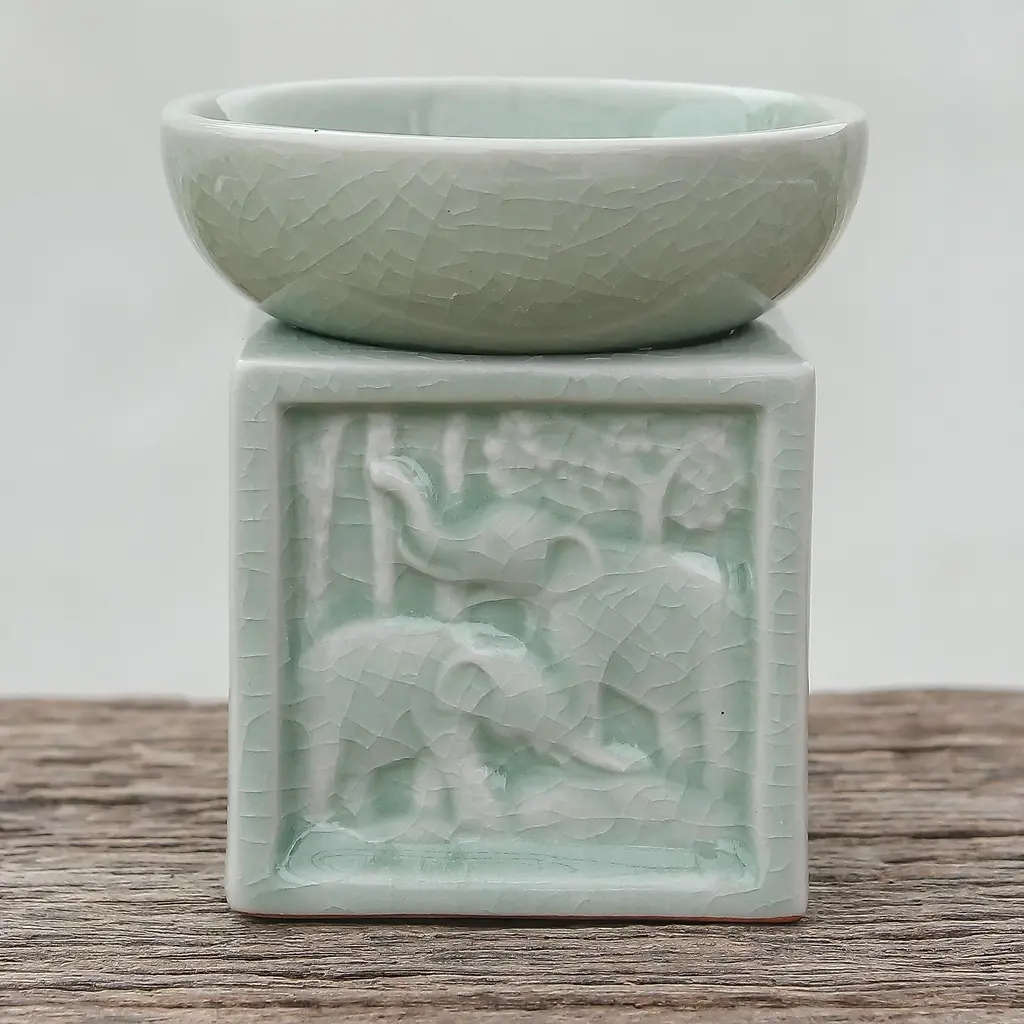 Elephant-Themed Celadon Ceramic Oil Warmer From Thailand- Elephant Jungle