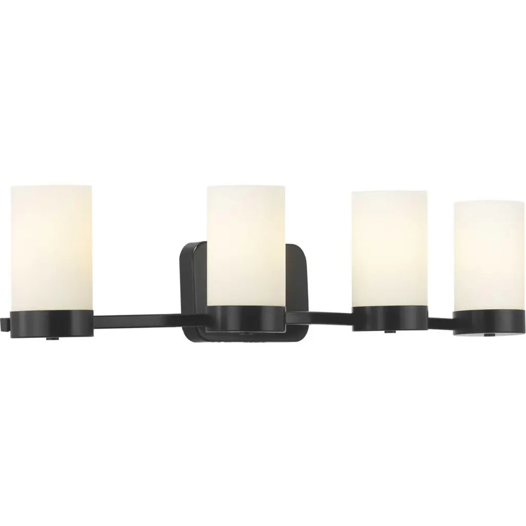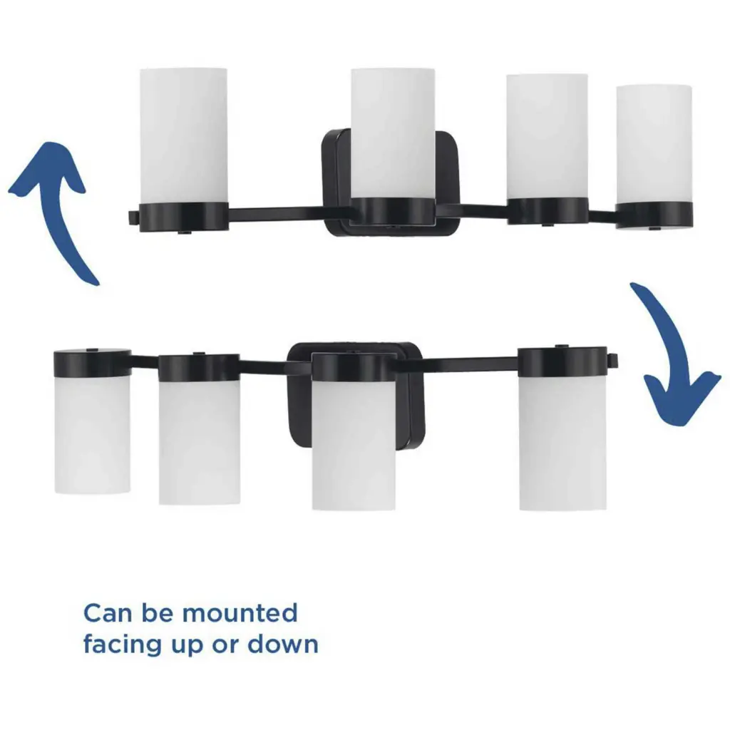 Achieve a Modern look with the Elevate Collection four-light bath and vanity. Etched glass white shades provide a striking contrast to the Matte Black finish. Fixtures can be installed with glass facing up or down for added customization.