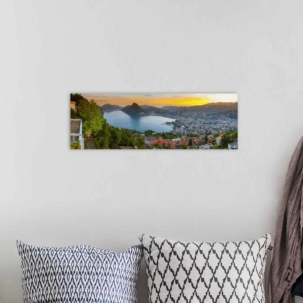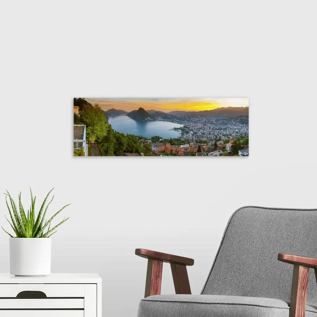 Elevated View Over Lugano Illuminated At Sunset, Lake Lugano, Ticino, Switzerland