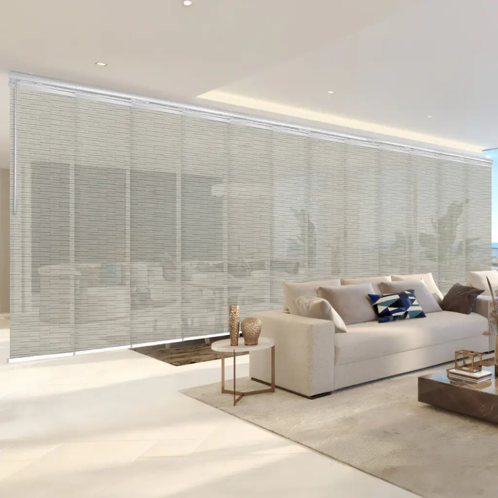 Central Design Products is pleased to introduce a new innovative panel track that offers easy 2-way installation, adding an alluring style and refined touch to your home decor. The double rail design of the track is sleek, compact, and reduces the overall footprint and weight of the installation, eliminating bulky, intrusive window treatments. Adjusting the panel height is a breeze � simply trim the panel, re-attach the liner, and install the panel weight. Detailed instructions are included.The panel track also features a patented slider design, made with aluminum and fitted with bearings that allow for durable and smooth operation. The sliders are stacked closer together than conventional panel tracks, reducing light bleed coming from the gaps between panels. This track has endless uses from dividing rooms, garages, offices, and closets to decorating windows and patios. Available in smaller sizes including 3, 4, 5, 6, and 7 panels. Extends from 140-260� wide. Each panel measures 23.5" wide and 116" tall, with a total installation height of 118.5" (includes the 2.5" rail track). The track can be wall or ceiling mounted. The panels can stack on the left or the right. The clearance from the wall is extendable from 1.25� to 3.25� and projection from the wall is extendable from 3� to 4.25�. Eliana panel is made from 69% Vinyl 31% Polyester, with a light filtering shade that blocks 50% of the light.