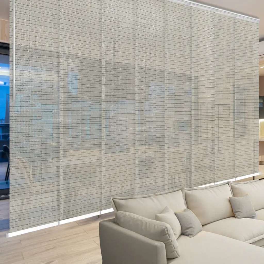 Central Design Products is pleased to introduce a new innovative panel track that offers easy 2-way installation, adding an alluring style and refined touch to your home decor. The double rail design of the track is sleek, compact, and reduces the overall footprint and weight of the installation, eliminating bulky, intrusive window treatments. Adjusting the panel height is a breeze � simply trim the panel, re-attach the liner, and install the panel weight. Detailed instructions are included.The panel track also features a patented slider design, made with aluminum and fitted with bearings that allow for durable and smooth operation. The sliders are stacked closer together than conventional panel tracks, reducing light bleed coming from the gaps between panels. This track has endless uses from dividing rooms, garages, offices, and closets to decorating windows and patios. Available in smaller sizes including 3, 4, 5, 6, and 7 panels. Extends from 130-175� wide. Each panel measures 23.5" wide and 116" tall, with a total installation height of 118.5" (includes the 2.5" rail track). The track can be wall or ceiling mounted. The panels can stack on the left or the right. The clearance from the wall is extendable from 1.25� to 3.25� and projection from the wall is extendable from 3� to 4.25�. Eliana panel is made from 69% Vinyl 31% Polyester, with a light filtering shade that blocks 50% of the light.
