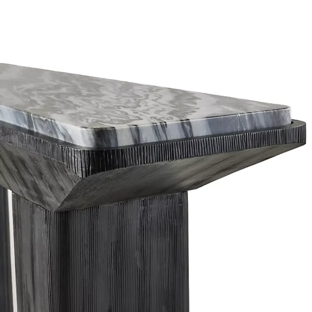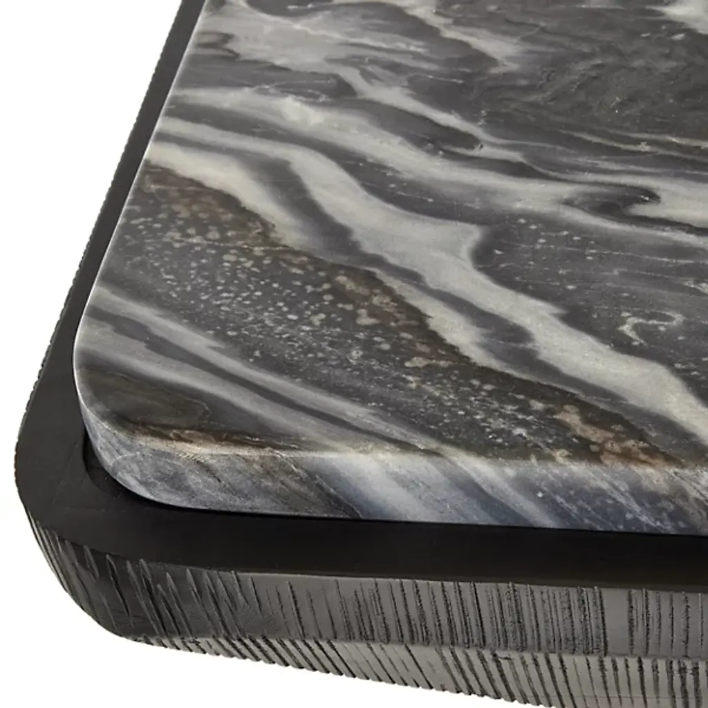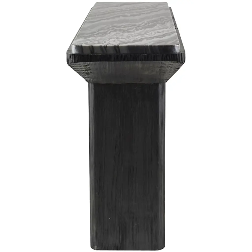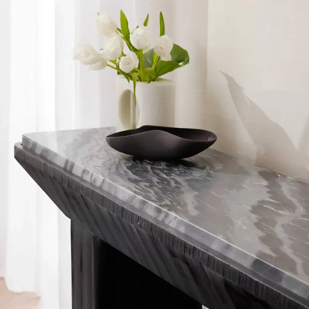 The Elio Console from Arteriors was designed to bring a ceremonial touch to your space. Crafted from rich ebony mango wood in a striking plinth shape, this exquisite piece is beautifully balanced by radius pillars and topped with an impressive slab of galaxy marble, creating an eye-catching focal point. The marble's unique variations ensure that each console is one-of-a-kind. Perfect for adding a touch of grandeur to any space, this console seamlessly blends functionality with artistic elegance.