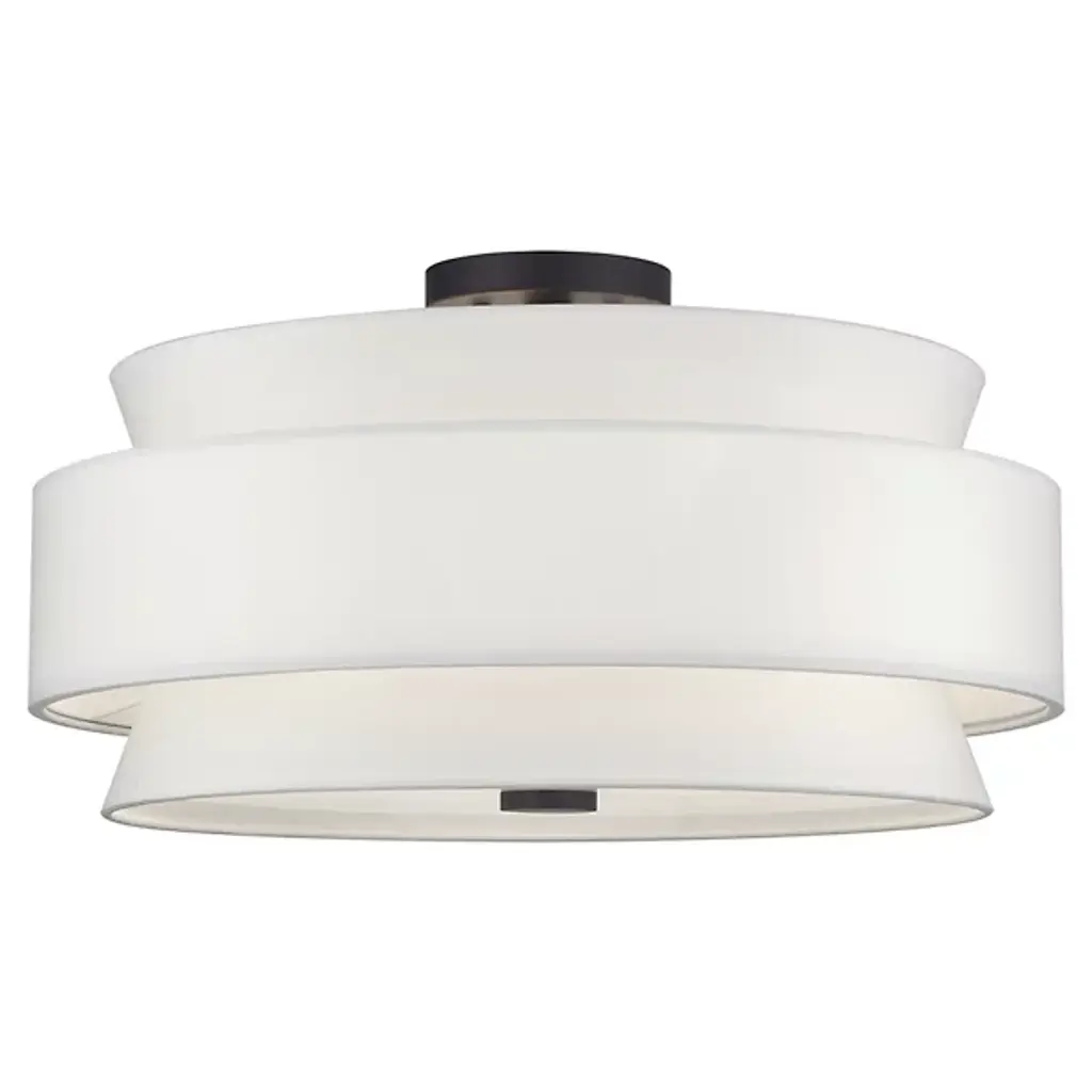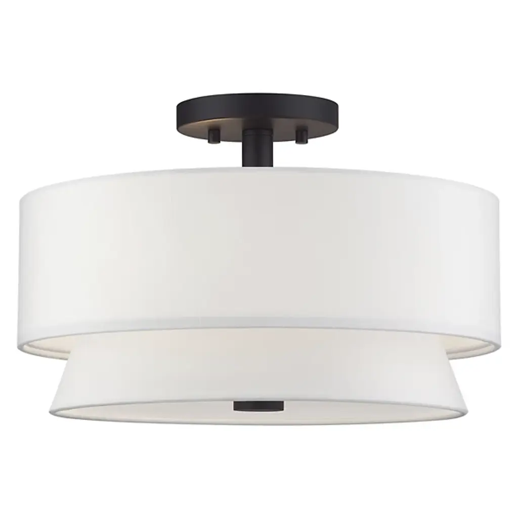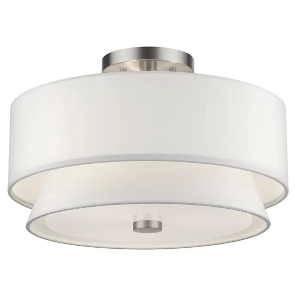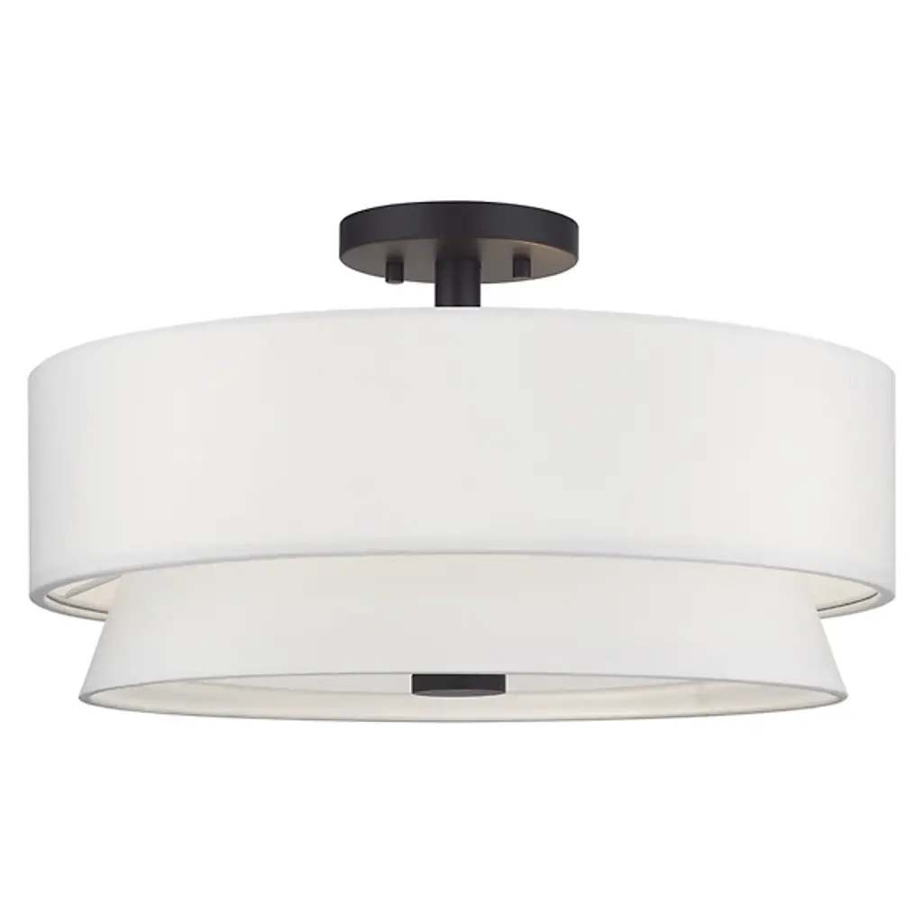 The Eliotte Semi Flushmount from Alder & Ore adds an expressive transitional style with its elegant double drum shade. Its handsome design draws the eye, as this fixture features a handcrafted off-white fabric hardback shade complemented by a satin white acrylic diffuser, offering a soft and subtle illumination. The design is constructed from durable steel and blends classic charm with contemporary elegance, bringing a sophisticated presence that casts a radiant glow.