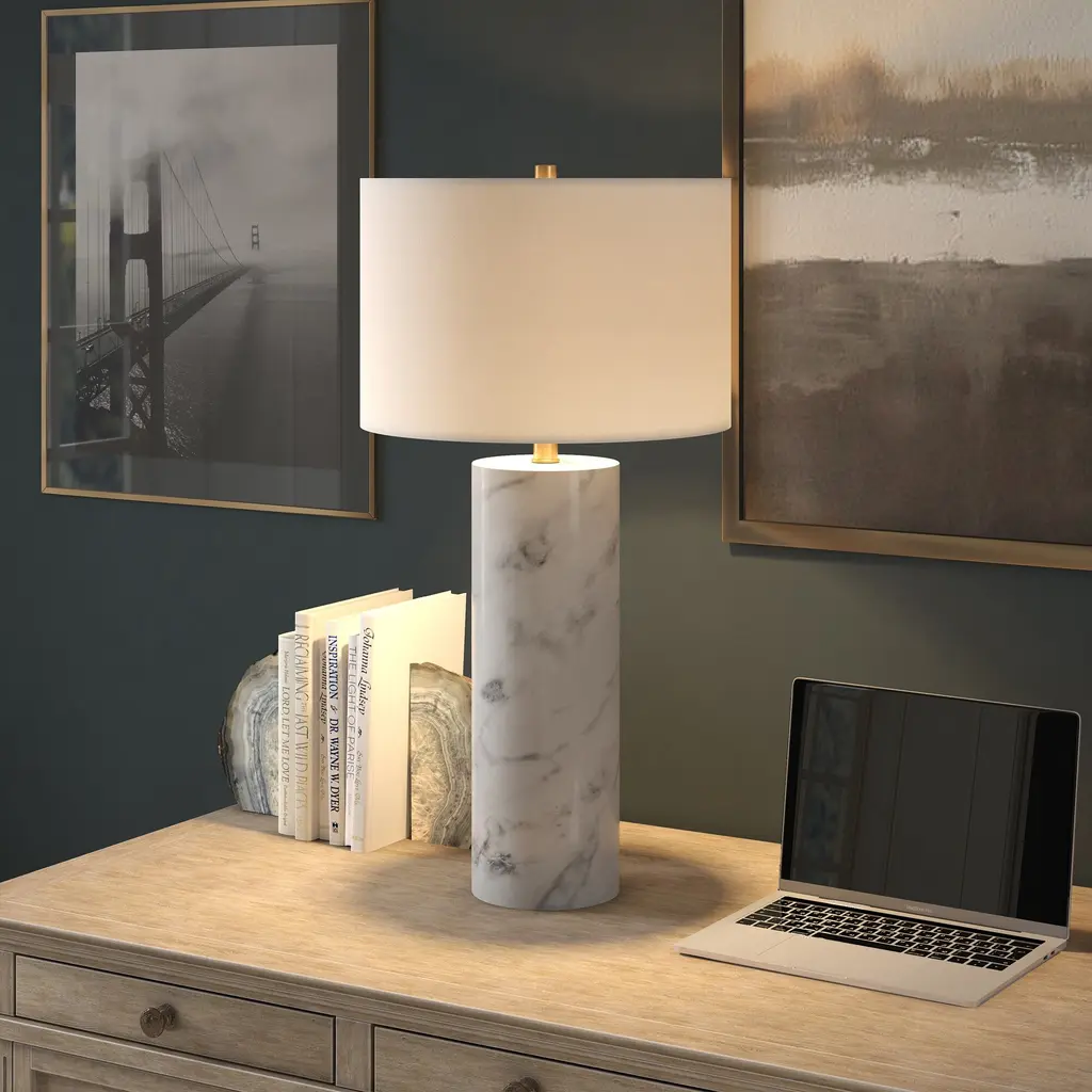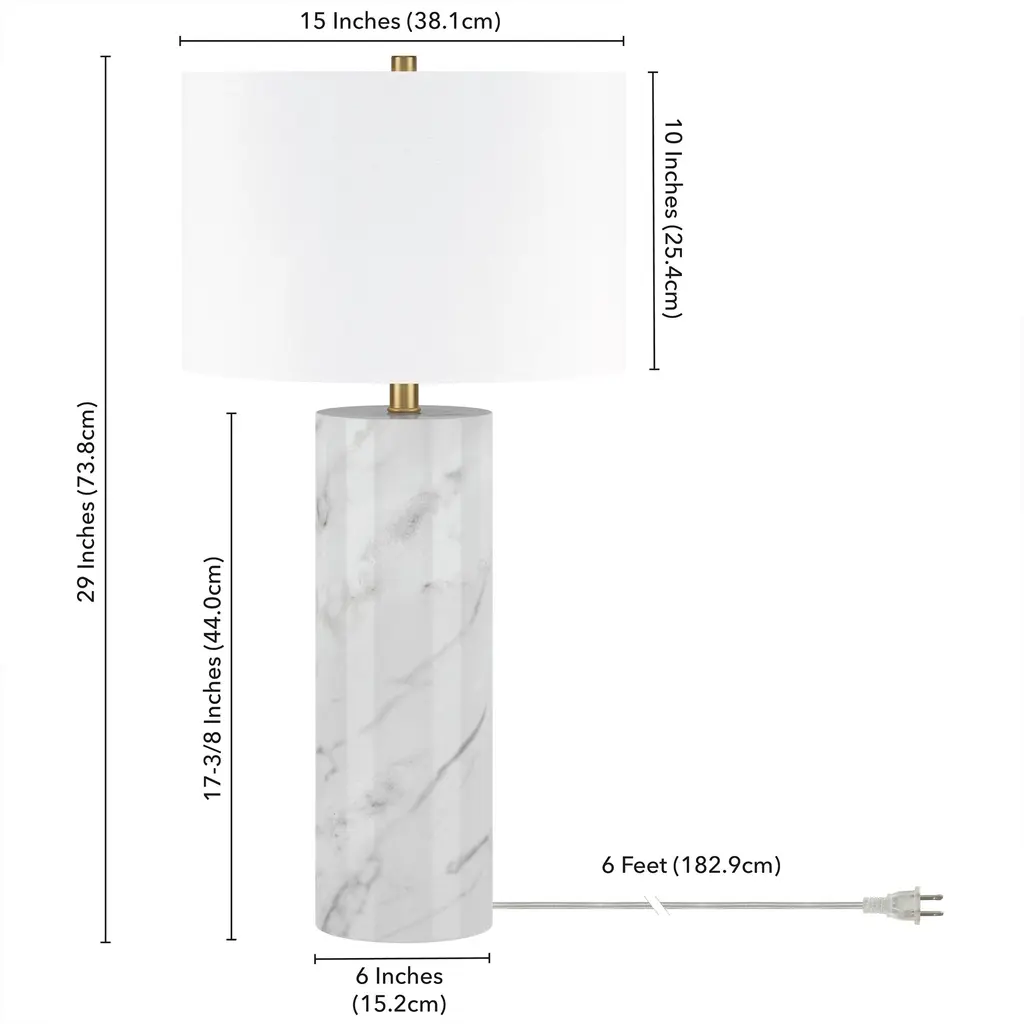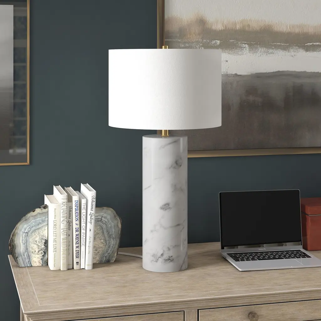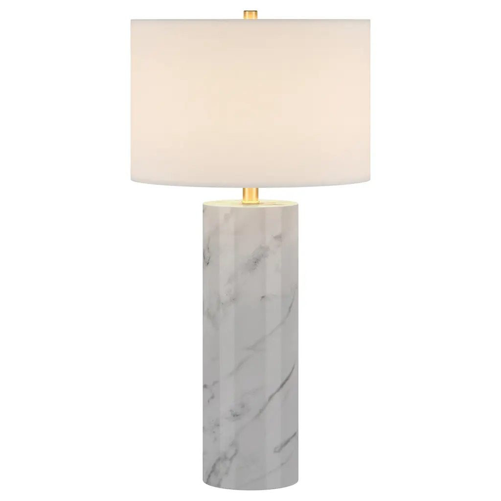Evoke classical Italian décor with a glam modern edge with this striking table lamp. The swirling pattern of the solid Arabescato marble pedestal base is accented with a sleek metal neck and finial, creating a subtle two-tone look. Topped with a crisp drum shade, this weighty fixture creates a stylish statement piece anywhere you use it.