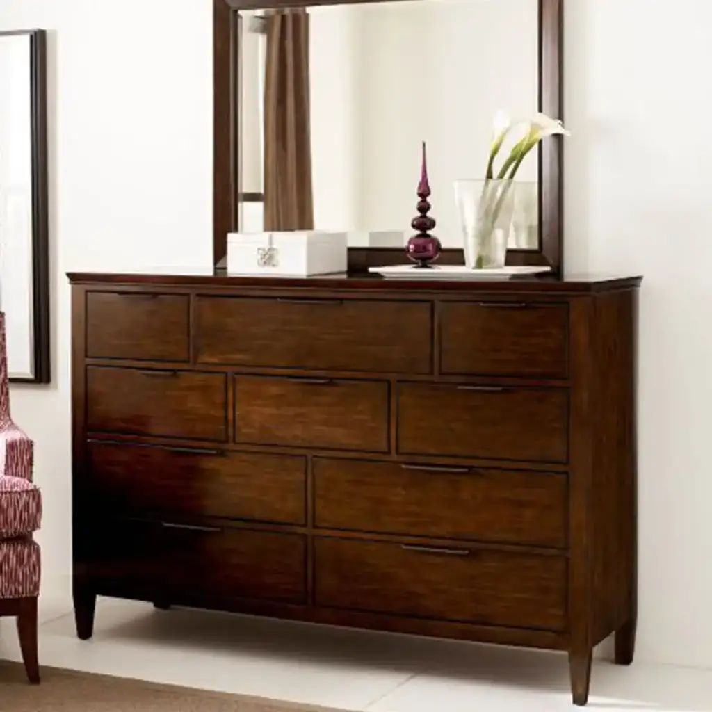 Discover the timeless elegance of the Luccia Bureau from the Elise Collection. This exquisite piece boasts ten spacious drawers, offering ample storage for your wardrobe and personal items. The innovative top center drawer features a flip-down design and pull-out functionality, perfect for organizing media essentials. Crafted with meticulous attention to detail, the bureau showcases genuine solid wood construction, combining the warmth of Alder with the durability of select hardwoods. Its sturdy frame is complemented by adjustable levelers, ensuring stability on any surface. The Luccia Bureau seamlessly blends classic charm with modern convenience, making it a versatile and stylish addition to your bedroom. Experience the perfect marriage of form and function with this stunning piece from the Elise Collection.