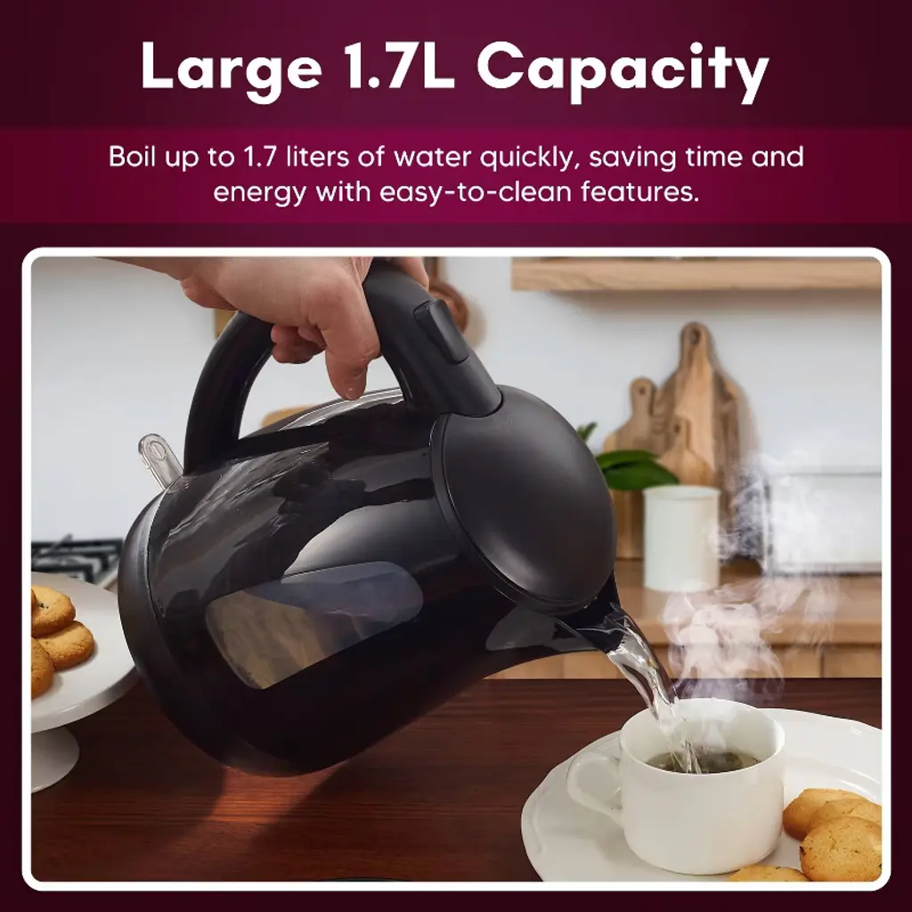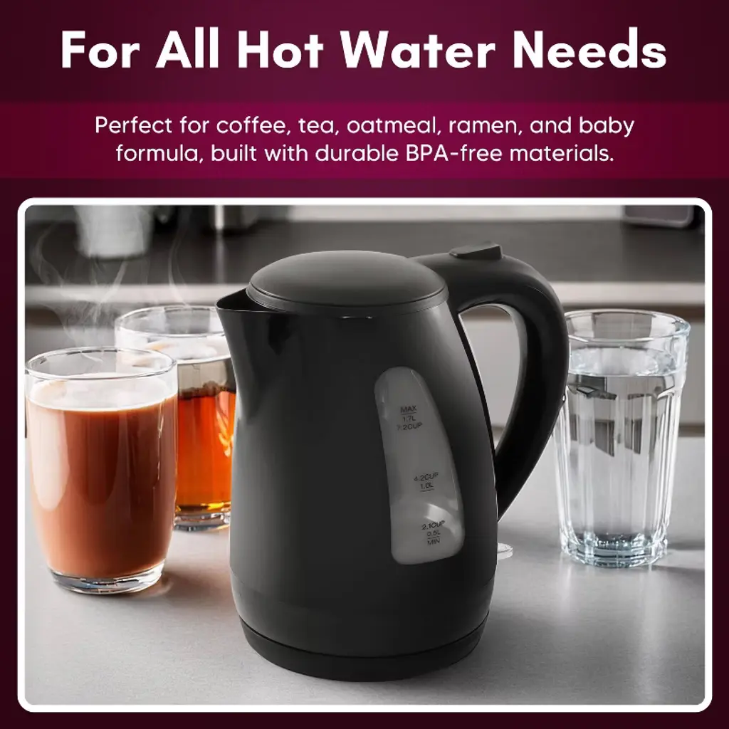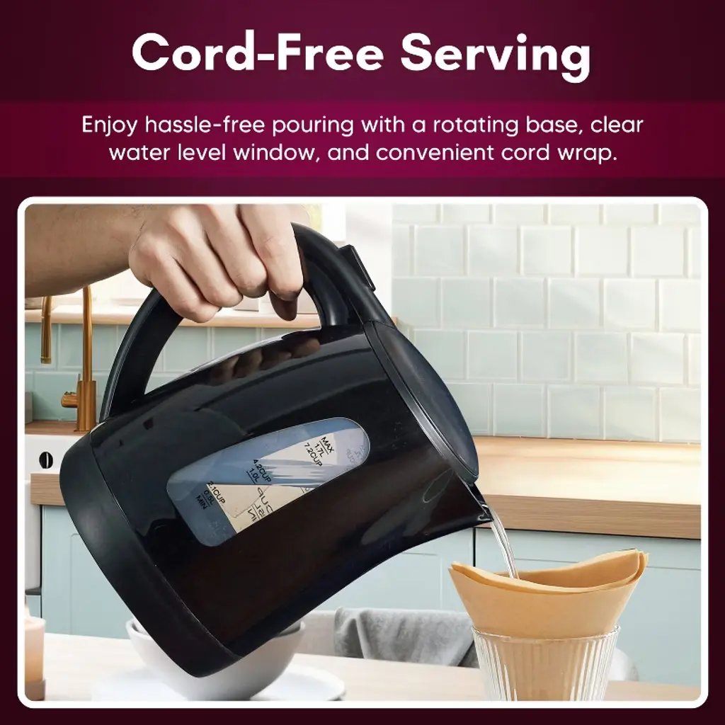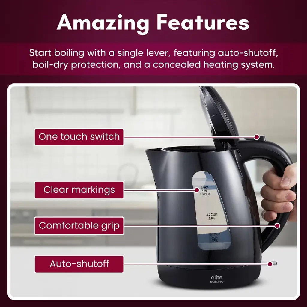 The Elite Cuisine 1.8Qt Electric Kettle is the perfect blend of style and functionality and is a great addition to any kitchen countertop. It boils water fast & efficiently, saving time and energy compared to conventional stovetop kettles. The exterior boasts an opaque water window with water level markings. The hinged lid with push button release makes it easy to open, fill and close. A removable mesh filter is easily taken out to clean and replace. There's also a 360° swivel base that allows for cordless serving and easy cleaning of the kettle.