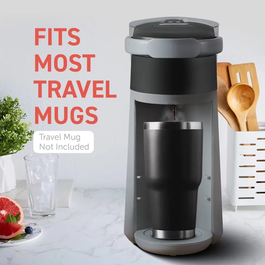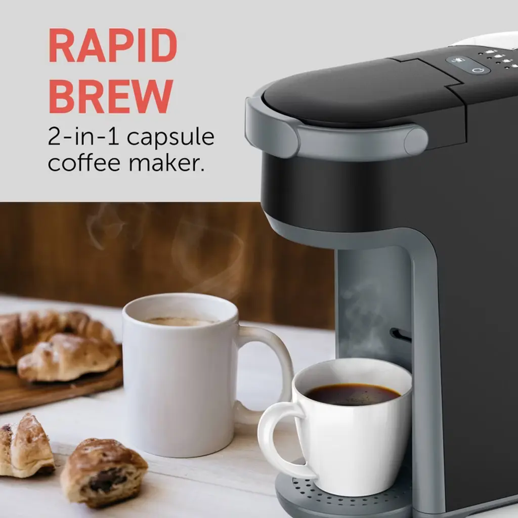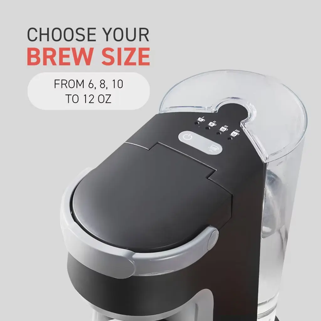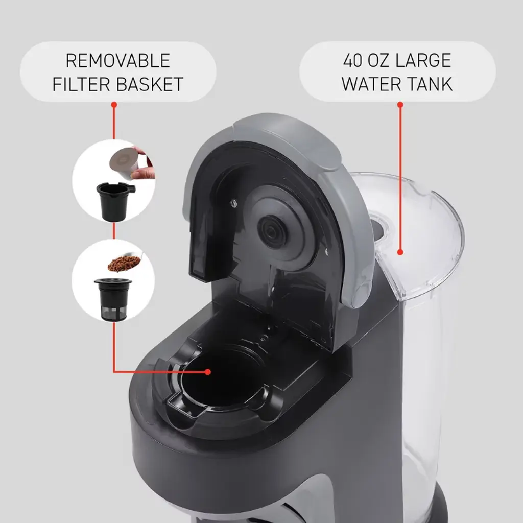 The Elite Cuisine 2-in-1 Capsule Single Serve Coffee Maker is designed with a sleek and compact profile, taking up minimal counter space and fitting perfectly into small or limited areas. Ideal for home or office kitchens, dorm rooms, or recreational vehicles, this coffee maker allows you to quickly and effortlessly brew your favorite K-cups or fresh coffee grounds to kick-start your day. With multiple cup size options (6, 8, 10, or 12oz) and a 40oz removable water reservoir, a fresh cup of coffee is always within reach.Featuring a user-friendly one-touch button and auto shut-off for easy operation, there's no need to overpay for a cup of coffee at a local shop. Use your preferred K-cup or coffee grounds in the included reusable filter for a convenient and quick start to your day or an afternoon pick-me-up. You won't need to add water for each brew, thanks to the large reservoir. The adjustable base accommodates various sizes of cups and travel mugs, ensuring you can brew directly into your favorite mug.Experience the convenience and efficiency of the Elite Cuisine Single Serve Personal Coffee Maker and enjoy a fresh cup of coffee on the go, setting the tone for a perfect day!
