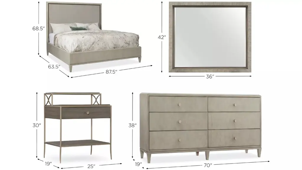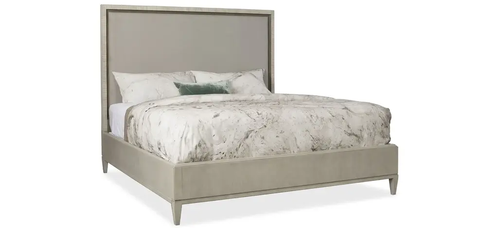 Create a serene refuge in your bedroom with the Elixir King Upholstered Bedroom set that exudes a feeling of comfort and simplicity. The headboard is upholstered in a soft, neutral texture, with the border, footboard and rails finished in a gray-beige finish applied to lightly sand-blasted walnut veneer for an organic and textural look. Bed includes headboard, footboard and rails.