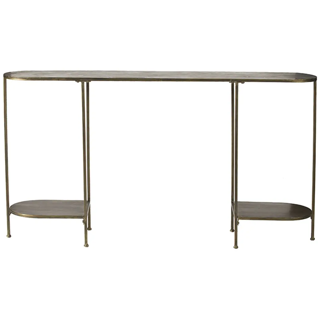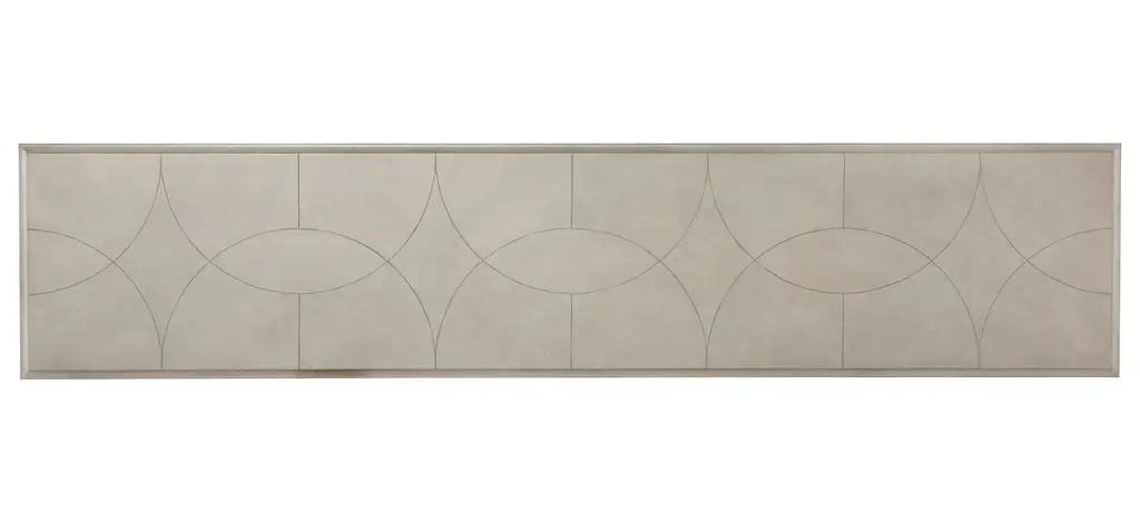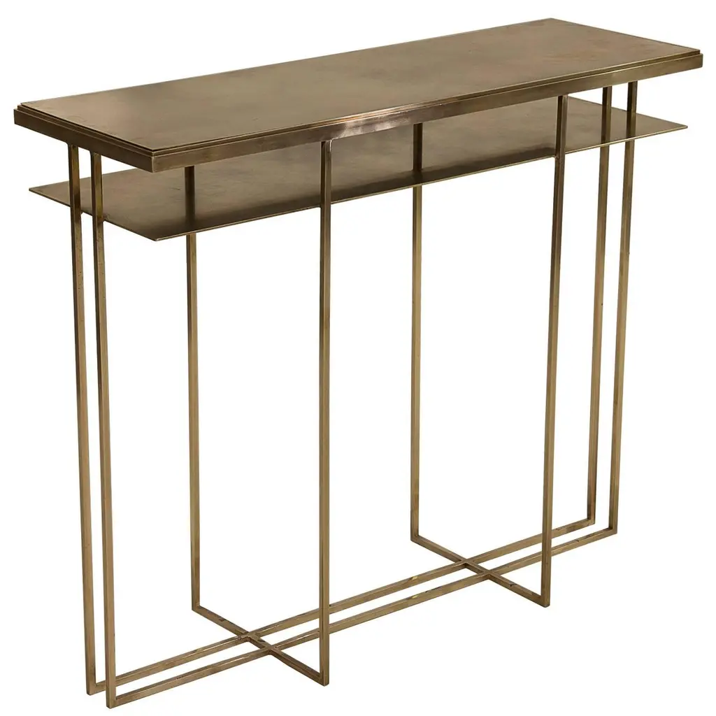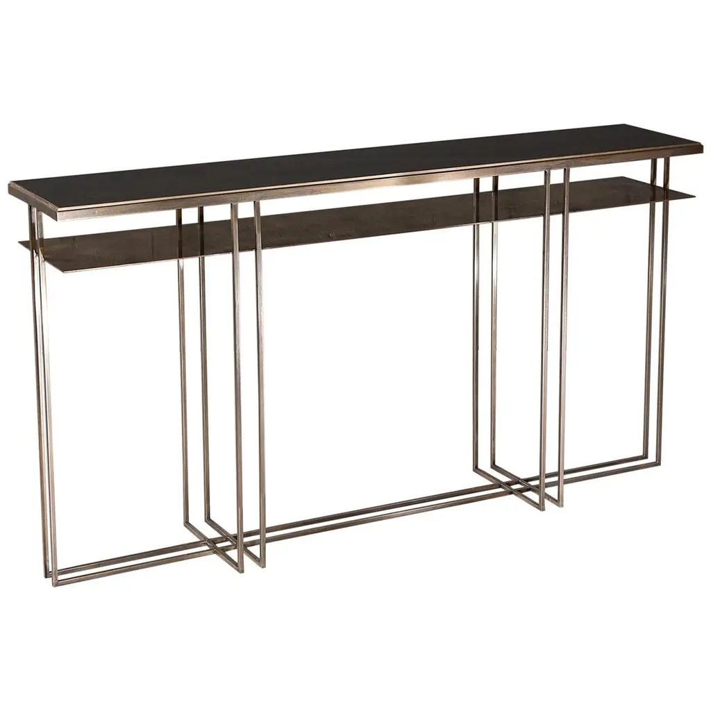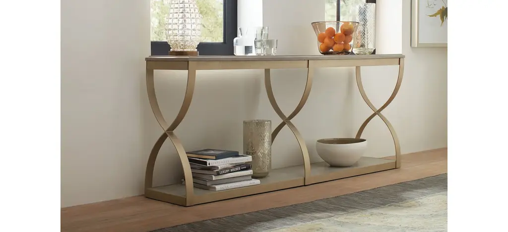 From the champagne silver metal stretchers forming a graceful X shape to the serene gray beige wood finish, the Elixir console table is an expression of soft modern artistic style that exudes simplicity and well-being.