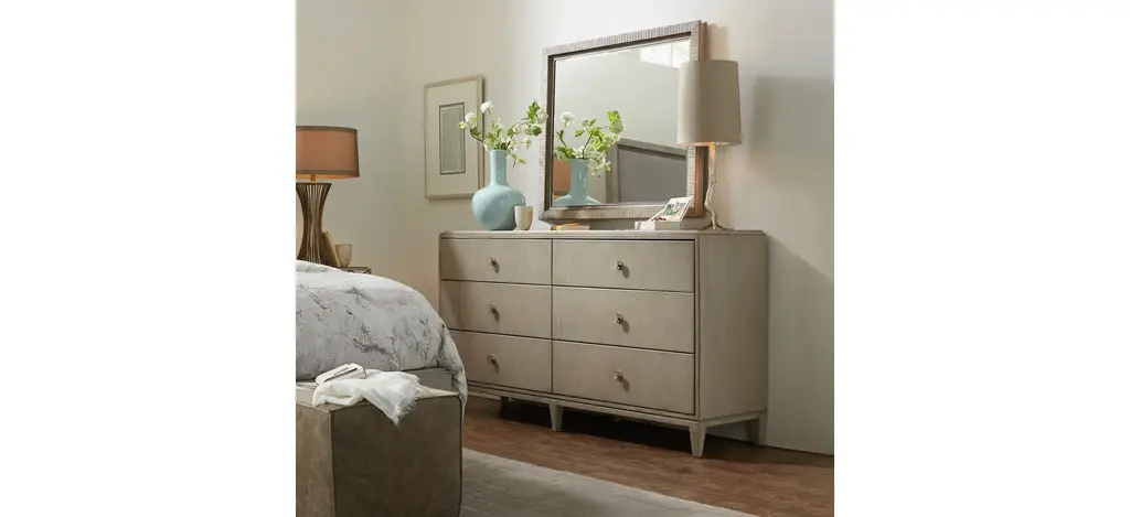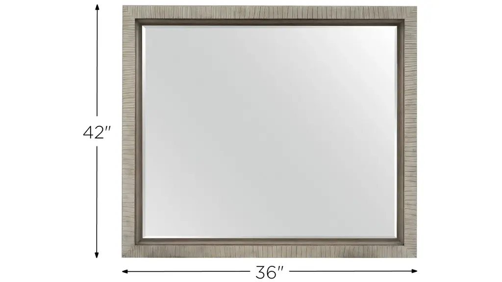 Crisp. Clean. Simple. Top your dresser, console or buffet with the soft modern Elixir Mirror to add style and character. Finished in a serene gray beige finish applied to lightly sand-blasted walnut veneer for an organic and textured look.