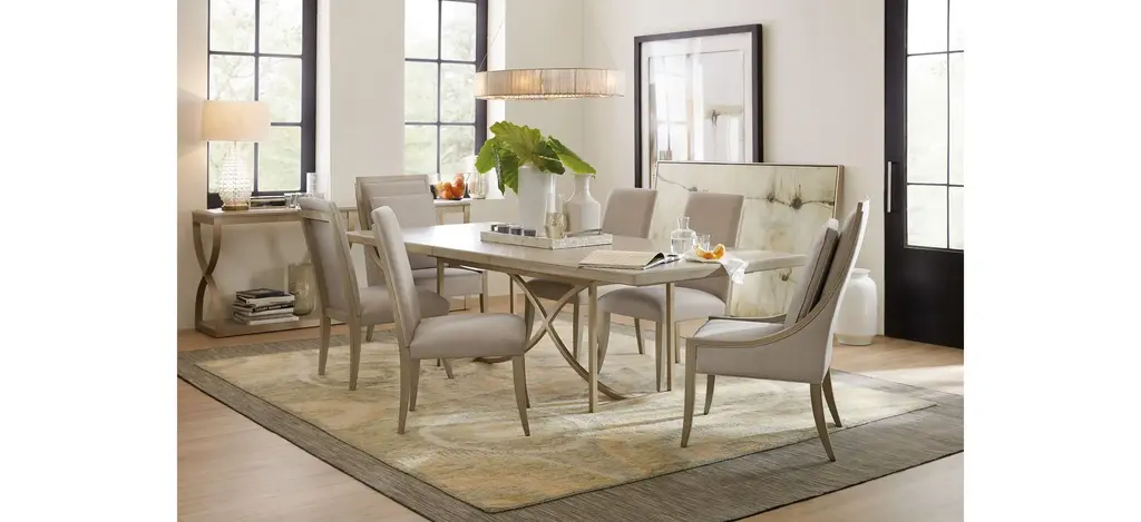 Gather the family around a fashion focal point with the soft modern Elixir Rectangular Dining Table, crafted of wood solids and Walnut veneers. The soft-brushed brass base in a stylish X-motif is topped with a herringbone pattern veneer table surface. With leaf, table extends to over 8 feet wide and comfortably seats 8.
