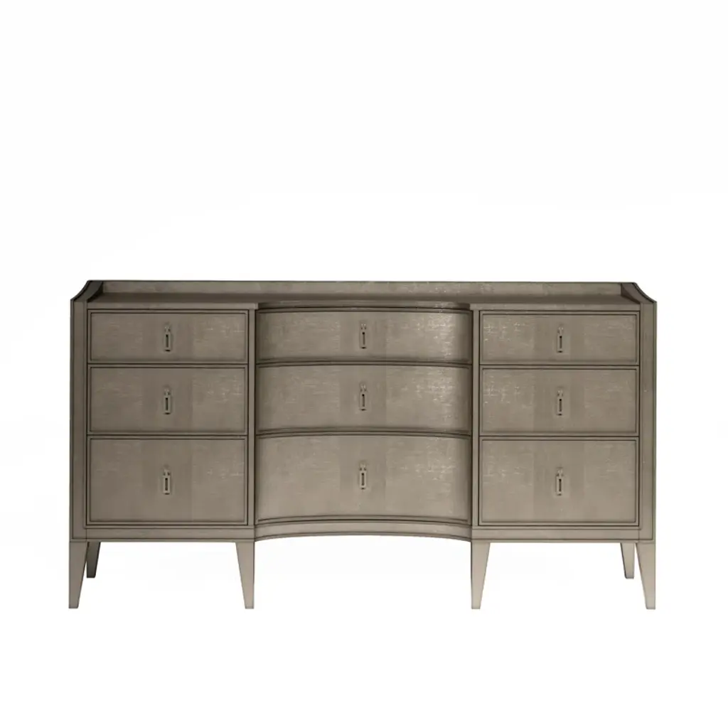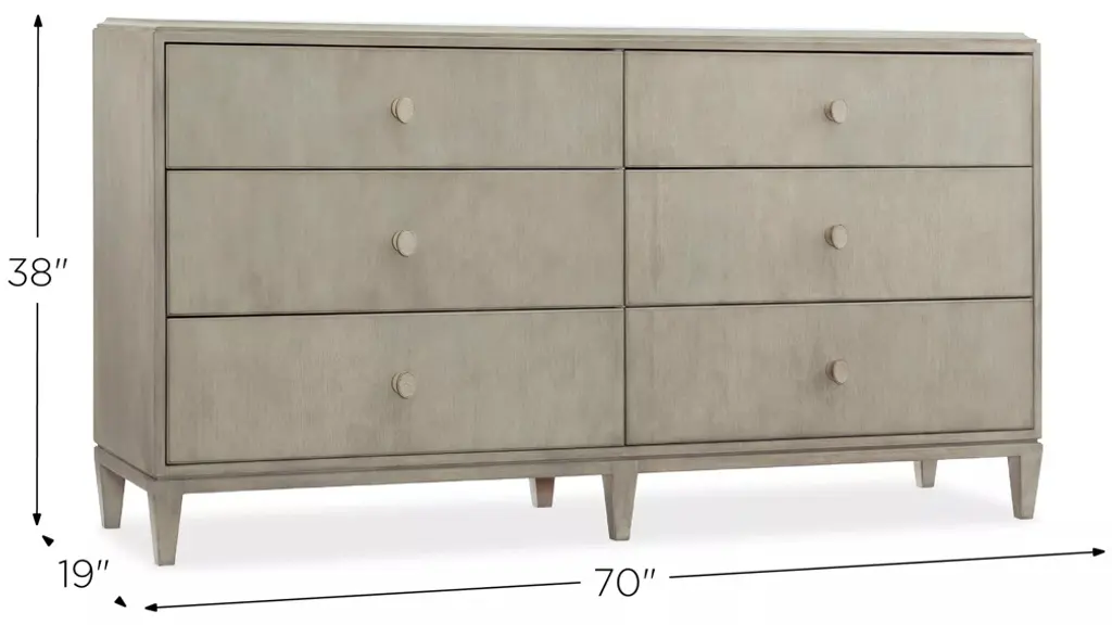 Serene with simplicity, the Elixir Six-Drawer Dresser has crisp, clean lines. Character is achieved through textural interest with the gray beige finish applied to lightly sand-blasted walnut veneer for an organic look. For added texture, the knobs are a faux shagreen. The bottom drawers are cedar lined, and there is a red drop-in felt liner in the top drawers.