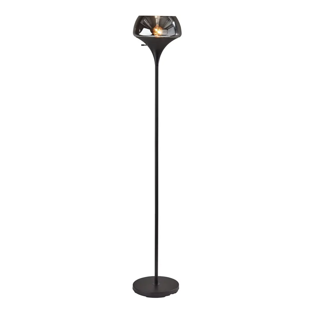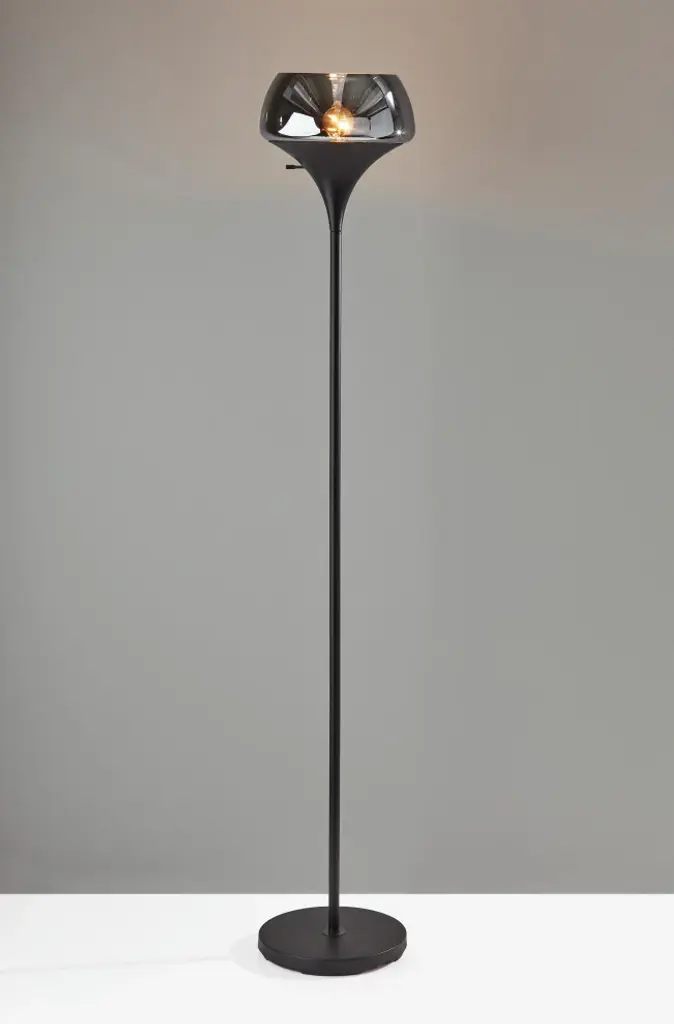 The Eliza Torchiere is sure to stand out in your home whether it is turned on or off. The options are endless with this edgy, contemporary style. Black metal is mixed with a smoked mercury glass shade. A convenient 3-way rotary switch is located on the shade cup. The 3-way rotary socket switch will only work with a 3-way light bulb, otherwise this lamp will function with simple on/off switch at its highest setting. All Adesso lighting product is either UL or ETL listed, meaning that it has been tested and approved to meet the government-regulated safety standards for the USA.