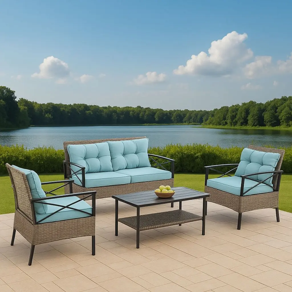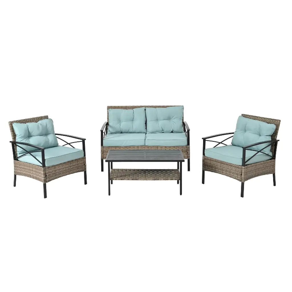 Eljget 4-piece Outdoor Patio Furniture Set Rattan Wicker Conversation Sofa Set With Coffee Table Light Blue Cushion