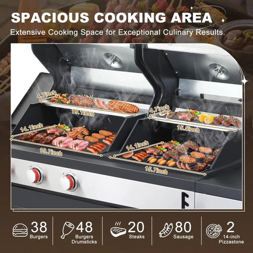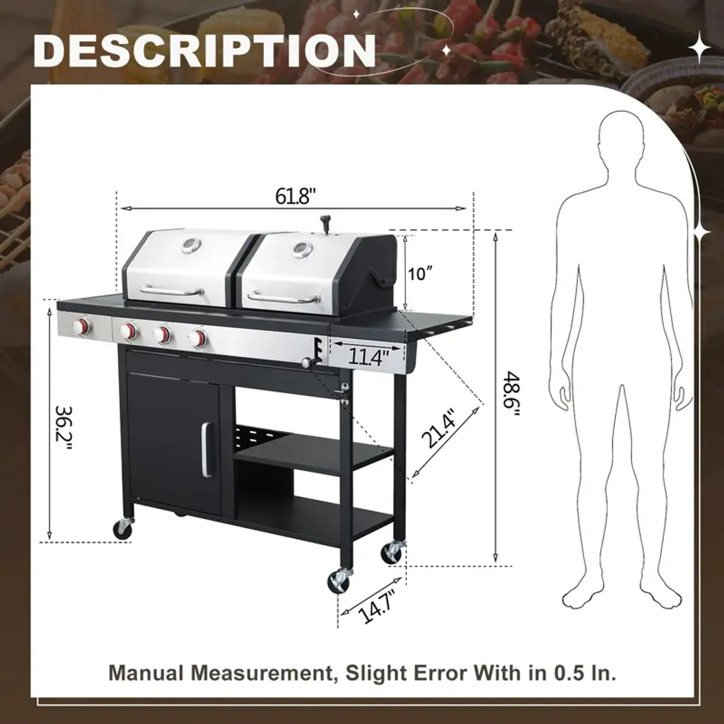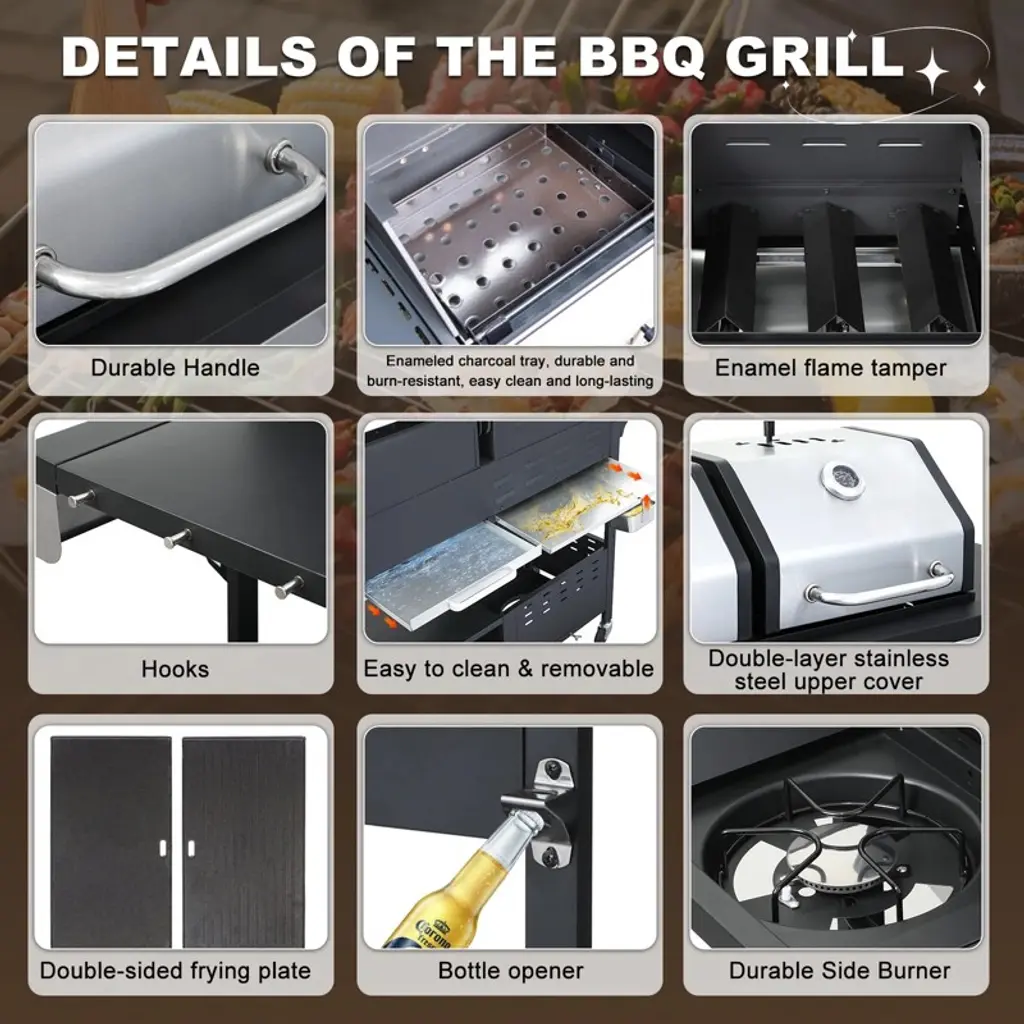 Whether you prefer the smoky flavor of charcoal or the convenience of gas, this grill has you covered. Versatile Cooking Options: Features a gas side (19.1x14.4 inches & 19.1x4.7 inches) and a charcoal side (15.5x14.4 inches & 15.5x4.7 inches) for flexible cooking styles. High-Temperature Powder-Coated Steel Firebox: Built to withstand extreme heat (up to 1020°F), ensuring long-lasting durability and reliability. Porcelain-Enameled Cast Iron Grates: Four rust-proof grates provide a spacious cooking area and are easy to clean. Powerful 37,230 BTU Output: Three gas burners (9,560 BTU each) and one side burner (8,550 BTU) deliver fast, even heating for perfectly grilled meals. Convenient Side Tables: The black powder-coated steel side tables (11.4x17.3 inches) offer extra workspace. With its durable construction, powerful performance, and user-friendly design, the Combo Grill is the ideal choice for outdoor cooking enthusiasts. Enjoy delicious meals and create lasting memories with family and friends!