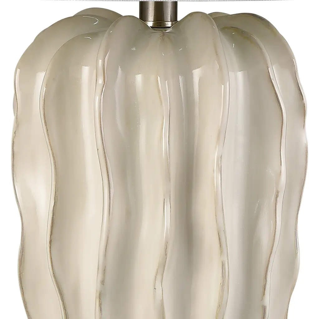 The Genesee Table Lamp features a hand-carved, rippled ceramic body with a glazed finish and timeless white linen shade. Finish may vary as this item has several hand-created artisanal qualities. 16in W x 16in D x 27.5in H White glazed finish - may vary as this item has several hand-created artisanal qualities Item made from earthenware Intended for indoor use only