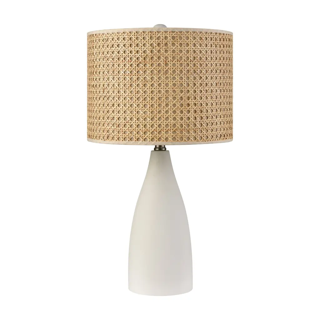 The Rockport Table Lamp showcases a rounded smooth-as-stone polished concrete base with a handcrafted shape story and a soothing neutral palette. A natural cane-style rattan shade adds warm color and textural contrast to this small-scale relaxed farmhouse-inspired lamp. 12in W x 12in D x 23in H Matte white finish Item made from concrete Intended for indoor use only