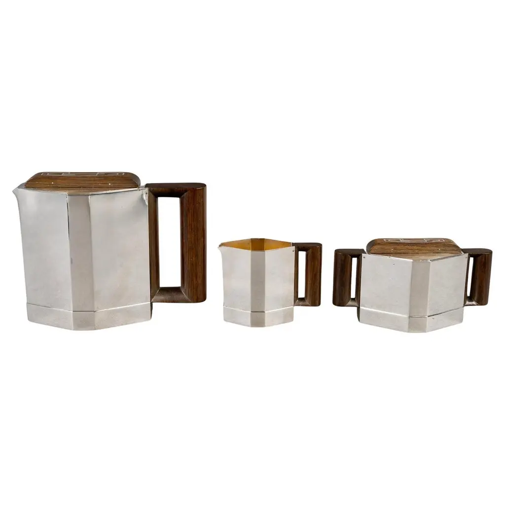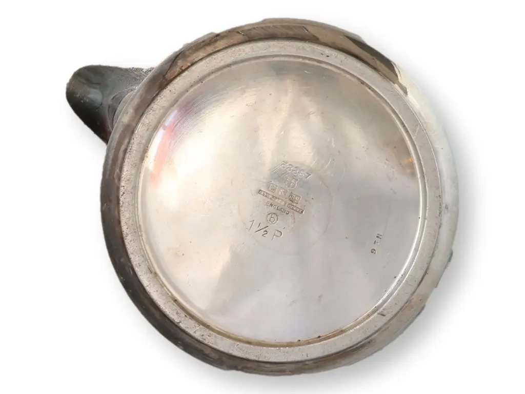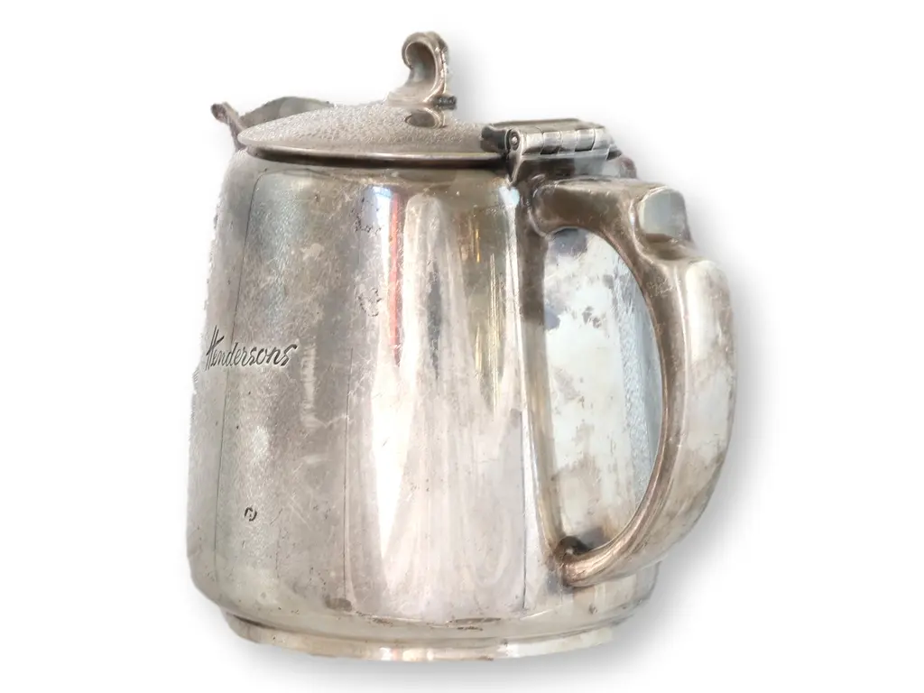 English silver-plated single tea service from ������Hendersons,” a caf�� or hotel, circa early 20th century. Includes teapot, creamer, and sugar bowl, all engraved and marked. Manufactured by Elkington & Co., one of England��s premier makers known for supplying fine households and distinguished establishments. Beautiful surface wear and patina from decades of service. Dimensions: tea pot 7.5" x 4.5" x 5.75: sugar bowl 3.75" x 2.75": cream 3.75" x 2.0" x 3.0"