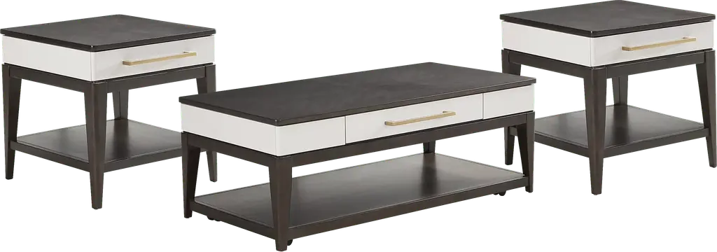 Experience the peak of contemporary luxury and create a truly stunning space with the Elko Falls collection. Featuring a multi-tone approach to contemporary design, the pieces in this set are each constructed with a rectangular tabletop in a rich espresso finish followed by a midsection crafted in a bright white color. The bases put on a leggy display with tapered feet finished in the same color as the tabletop. The tables are even equipped with dust proof drawers for easy storage. Oversized bar pull hardware on the drawers complete the look in epic fashion. cocktail: 48"W x 24"D x 17.5"H, end: 22"W x 22"D x 22"H