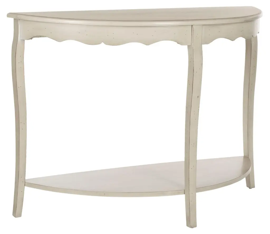A console flanked by two chairs brings a harmonious look to any space. This console is made of poplar in a lovely eggshell finish with intentional distressing.