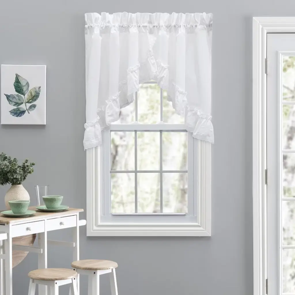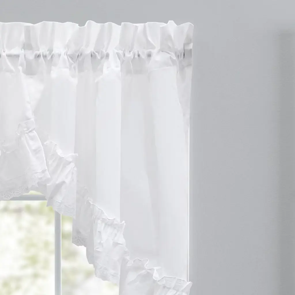 Transform your windows with the Ellis Regency ruffled victorian swag. Add some style and charm to your windows with this swag. The swag is made of a polyester and cotton blend fabric that is easy to wash and maintain. The swag has a 1.5-inch rod pocket that fits most standard rods and a lace edge for an elegant look. The swag measures 82 inches wide and 38 inches long and is lined for extra durability and privacy. The Ellis Regency ruffled victorian is a perfect choice for any room in your home, whether you want to create a cozy bedroom, a chic living room, or a formal dining room. Color: White.