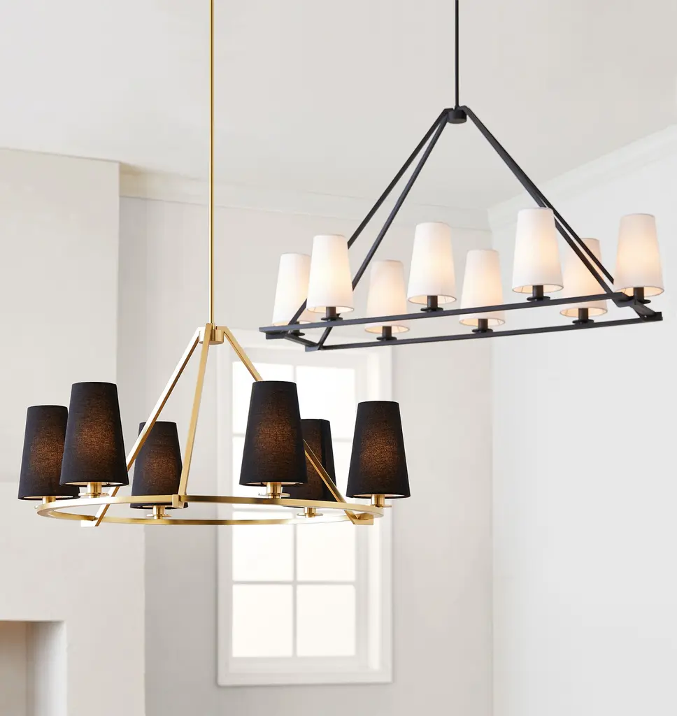 Inspired by classic candelabra-style chandeliers, our Ellison Single Tier Chandelier mixes traditional style with contemporary touches. Designed with a circular or rectangular open frame, and available with or without elegant linen shades, Ellison makes a grand statement in living rooms, dining areas, kitchens, and entryways of all sizes. Choose from several finish options. Details You'll Appreciate An updated take on a classic design Features elevated rectangular arms and detailed connections Available with or without linen shades Designed in Portland, Oregon and made at our Portland factory from domestic and imported parts Product Specifications Brass fixture For indoor and covered outdoor use (UL Rated Damp) Hardwired; professional installation recommended Integrated vault mount accommodates a slope up to 45 degrees Assembled to order at our Portland, Oregon factory