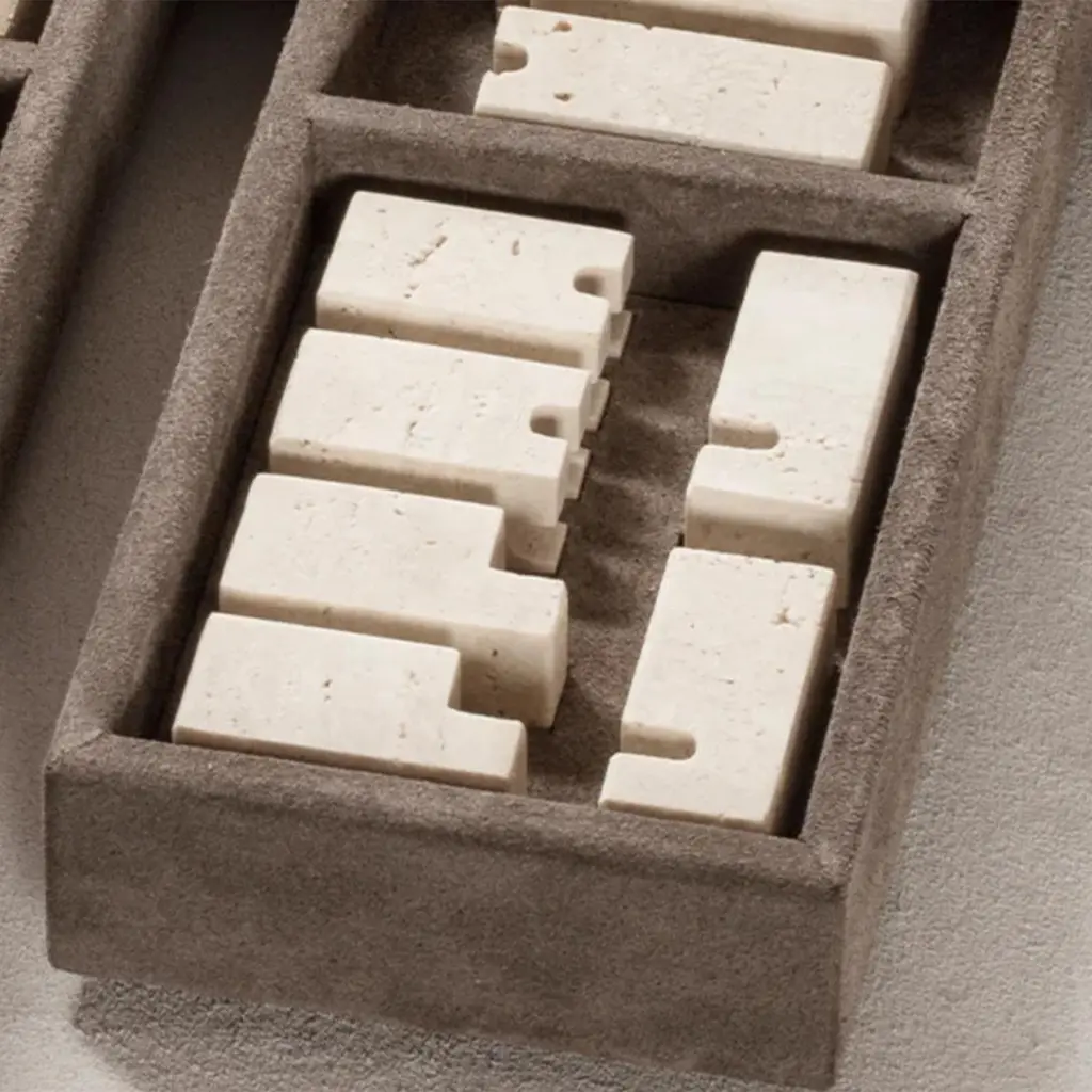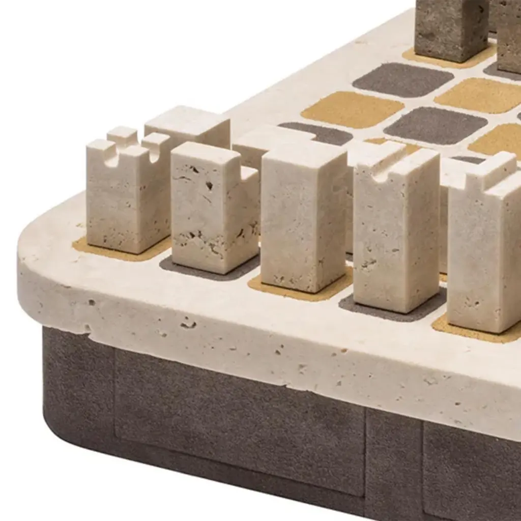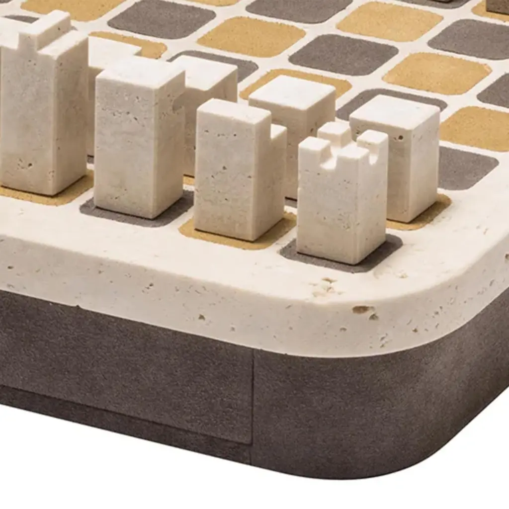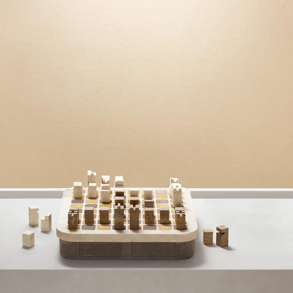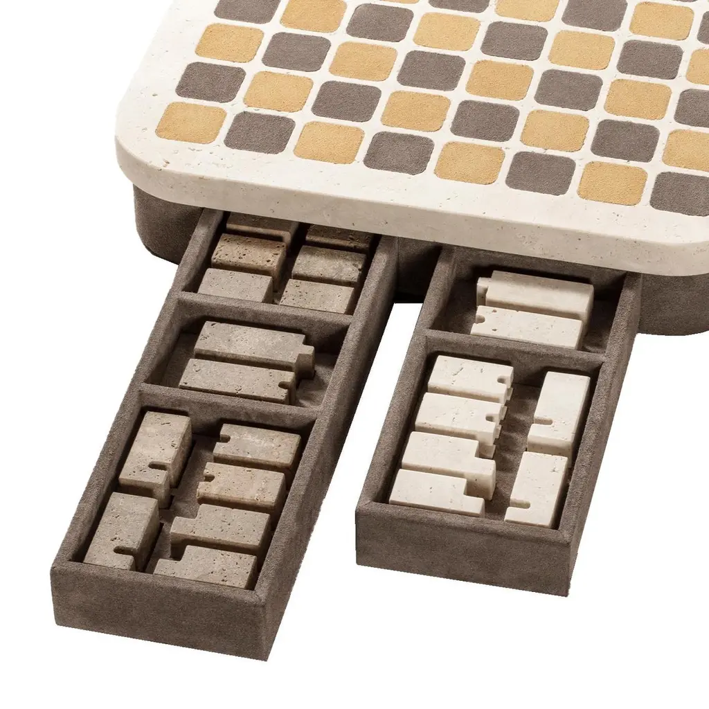 Chess Game Elmor Travertine with structure and pieces in carved and polished travertine. Each chess box is coveredwith suede leather. With 2 drawers included for pieces storage.