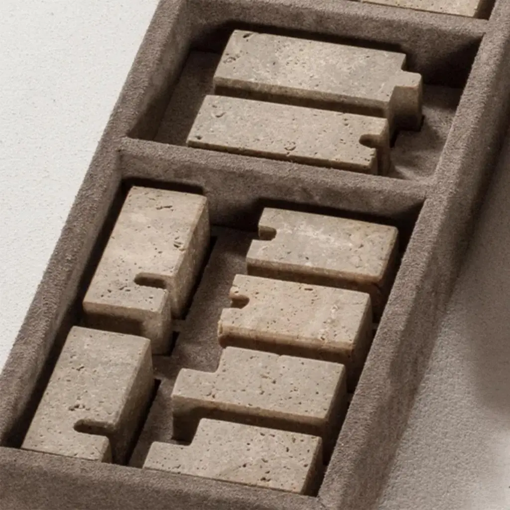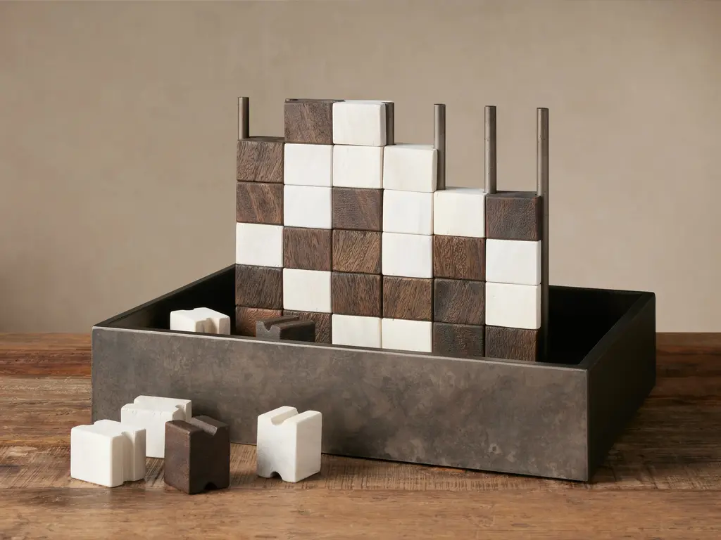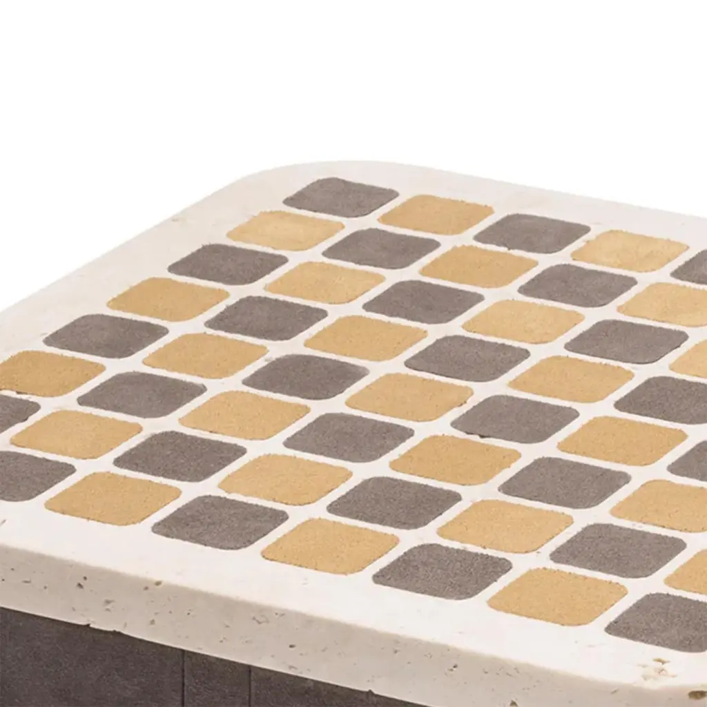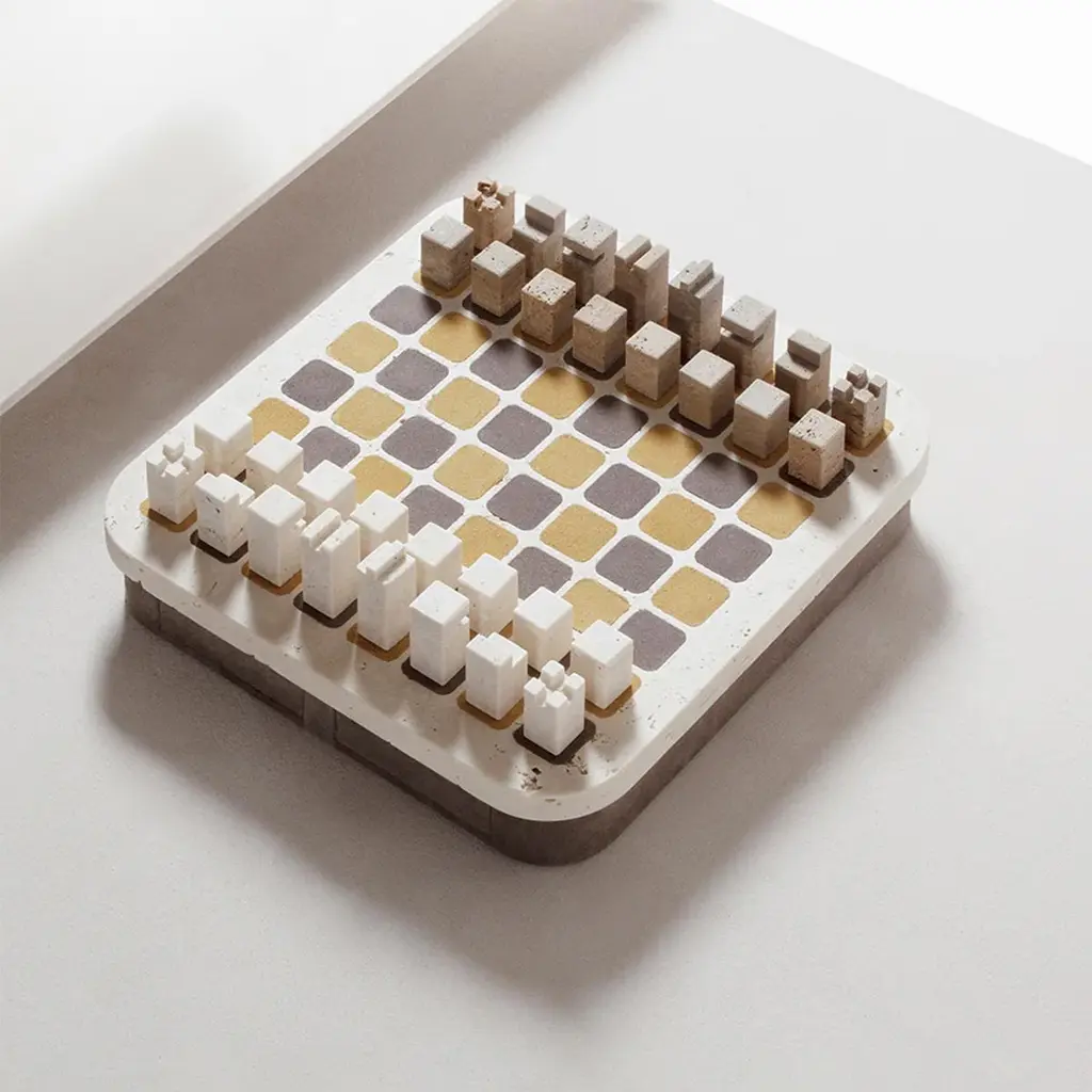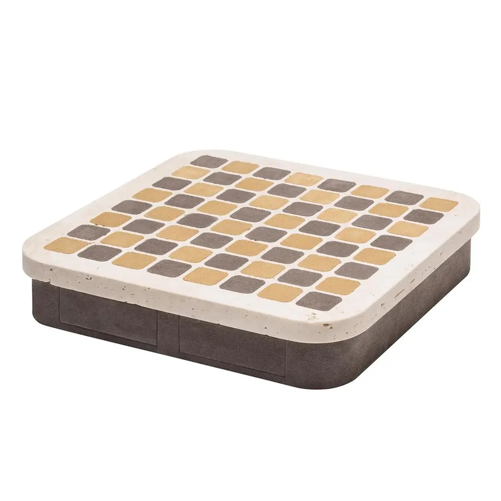 Chess Game Elmor Travertine with structure and pieces in carved and polished travertine. Each chess box is coveredwith suede leather. With 2 drawers included for pieces storage.