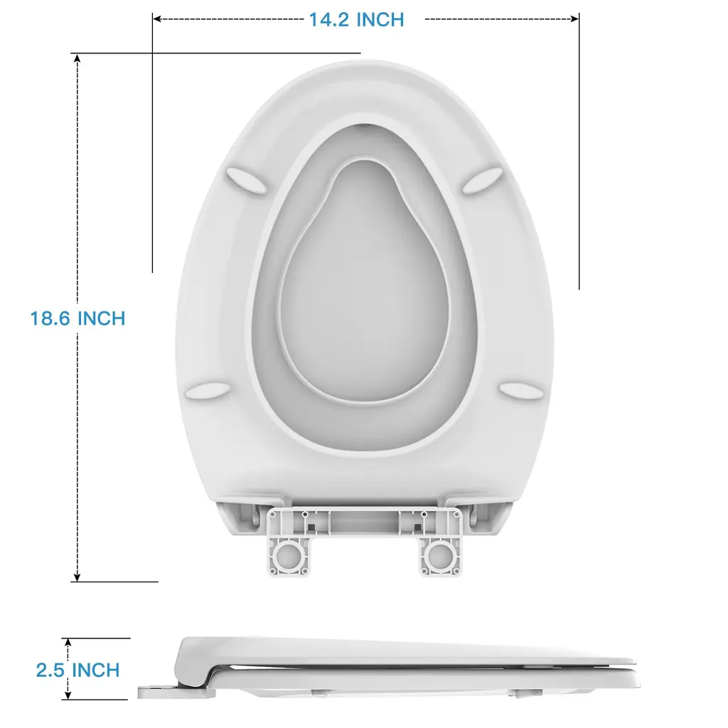 Elongated Toilet Seat: Designed to fit most standard elongated toilet bowls, this elongated toilet seat has dimensions of Length: 18.3-18.8 inches and Width: 14.2 inches, with a mounting hole distance of 5.15-6.18 inches. It is essential to measure your toilet before ordering to ensure compatibility.Slow and Quiet Close: The toilet seat features a slow-closing mechanism to prevent loud slamming and potential hand pinching. This not only enhances a peaceful experience, especially during sleeping times, but also ensures the longevity of the toilet seat by minimizing impacts.Durable Thick Material: Crafted from high-quality thick polypropylene plastic, this elongated toilet seat is resistant to stains, chips, scratches, and cracks. The material provides a softer surface compared to painted wood and other plastics, offering comfort and durability. With a solid structure, the toilet seat can bear 300 kg and more.Ergonomic Design: The ergonomically designed elongated toilet seat enhances sedentary comfort, providing a comfortable toilet bowl seat. Integrated bumpers on the back of the seat prevent shifting and sliding, ensuring stability and user satisfaction.Easy to Install & Never Loosen: The quick-detach design of the toilet seat allows for easy installation and removal. The necessary screws for installation are included, and two rubber pads are provided to protect the hinge. The integral hinge bracket ensures stable fitting and prevents loosening.