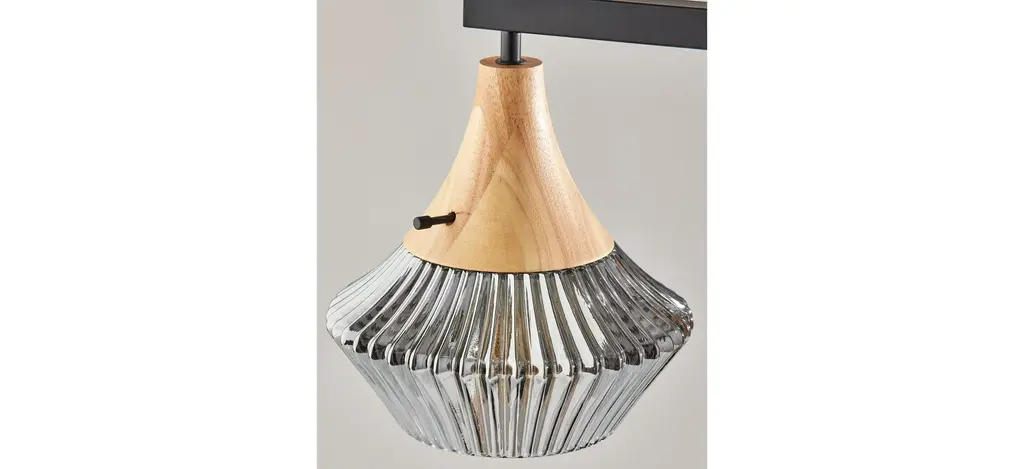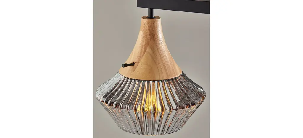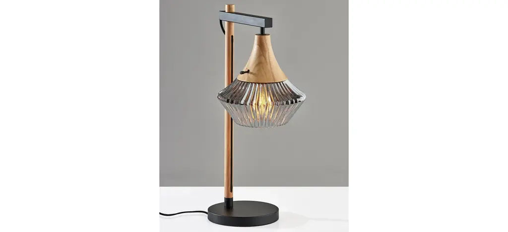 Beauty is in the details when it comes to the Elsie Table Lamp. From the ribbed, glass shade to the natural wood that highlights the material's grain, to the stunning silhouette, every aspect of this lamp exudes elegance and style. Anchored by a round base, a thin natural wood pole extends before meeting with a short arm at a 90o angle. Suspended from the arm is a stunning light shade with a natural wood base leading to ribbed glass that throws soft light from a 60W bulb. The fabric-covered cord not only powers the lamp but stands out as a design piece, visibly running down the length of the wood pole.