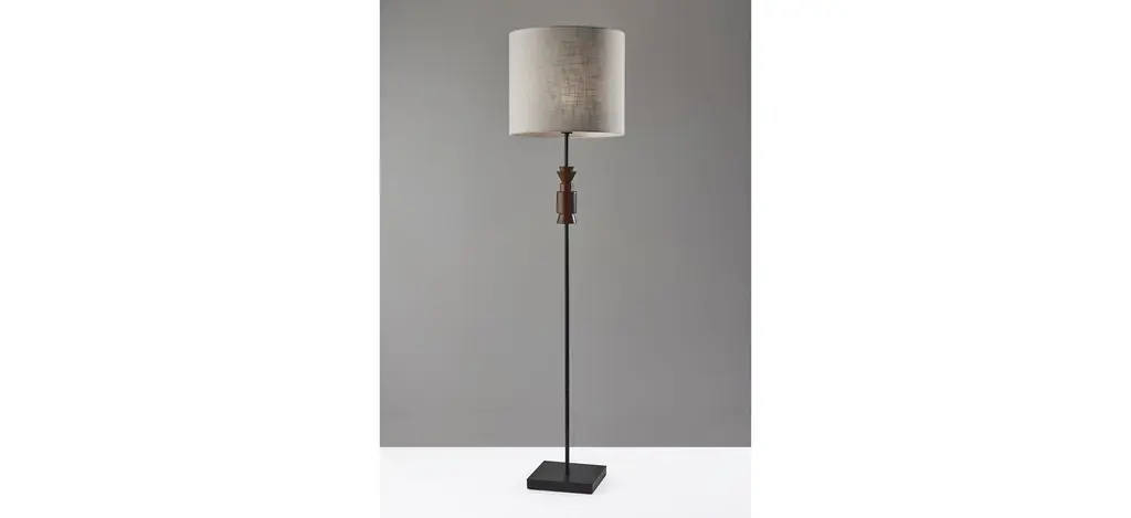 Brighten your space in modern style with the 68" Elton floor lamp. With a black metal square base and stem, the lamp brings a pop of style with a bold geometrically shaped wooden accent on the stem, making it the perfect addition to any modern decor. The lamp is topped off with a 17" diameter and 15" tall drum shade made of textured fabric to softly distill the light from a 100W bulb. Operated by a 3-way rotary switch located on the socket, the lighting level can be easily changed between low, medium, high, and off when using a 3-way bulb. When using a regular bulb, the rotary switch turns the lamp on or off.