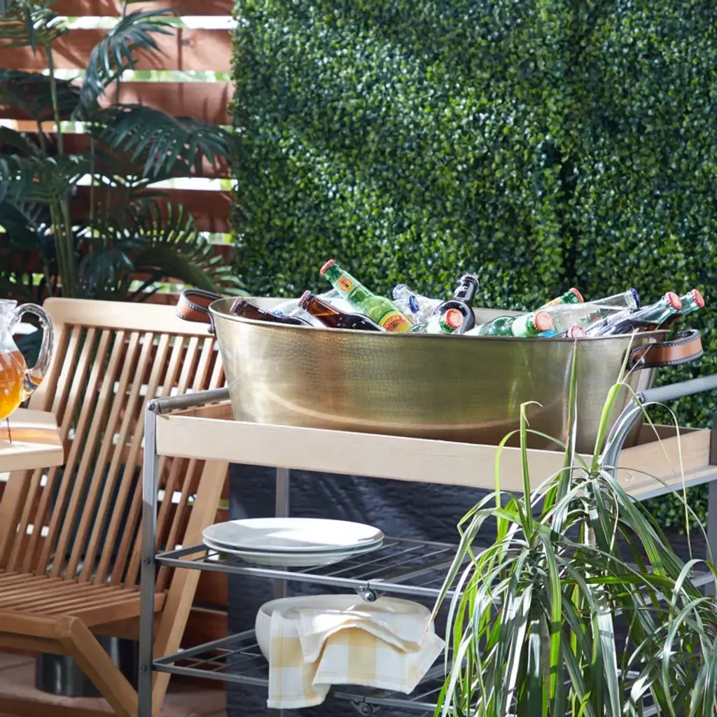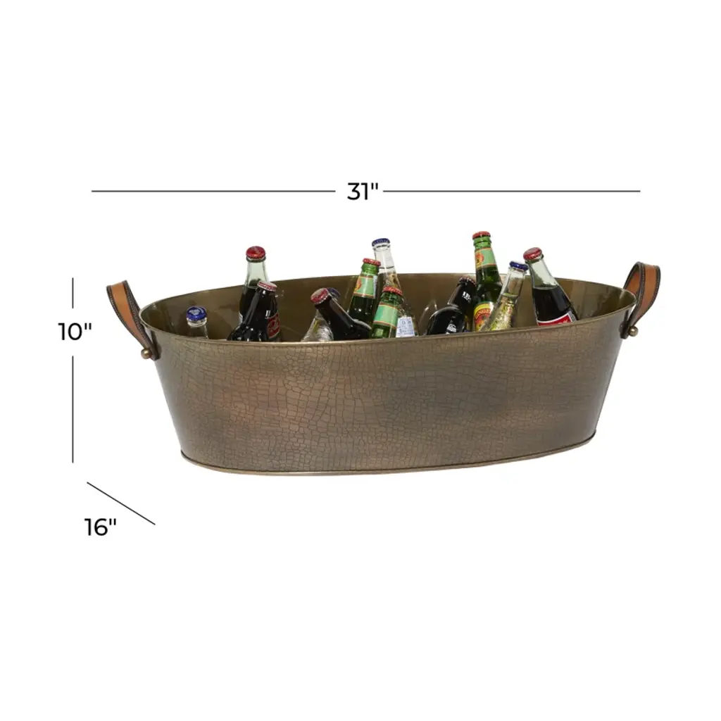 Make your guests feel welcome with the refreshing style of this classic beverage tub. It’s made of metal in an antique brass finish. A crackled texture and two stitched leather side handles elevate the look. This 31” wide and 10” high oval tub offers plenty of room for ice and your favorite bottles. We love that it’s also great for storing firewood, magazines, or toys. This beverage tub completes the look in any traditional or bohemian setting.