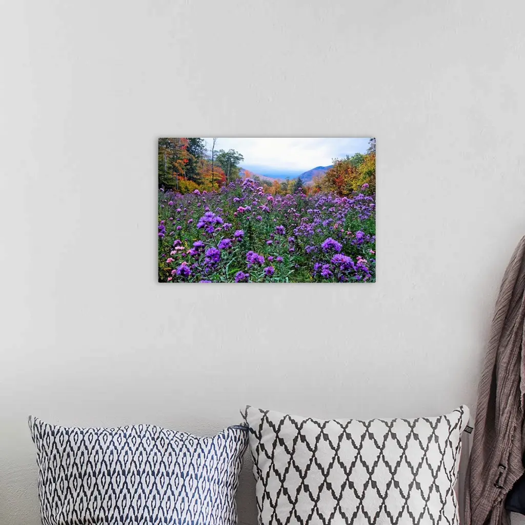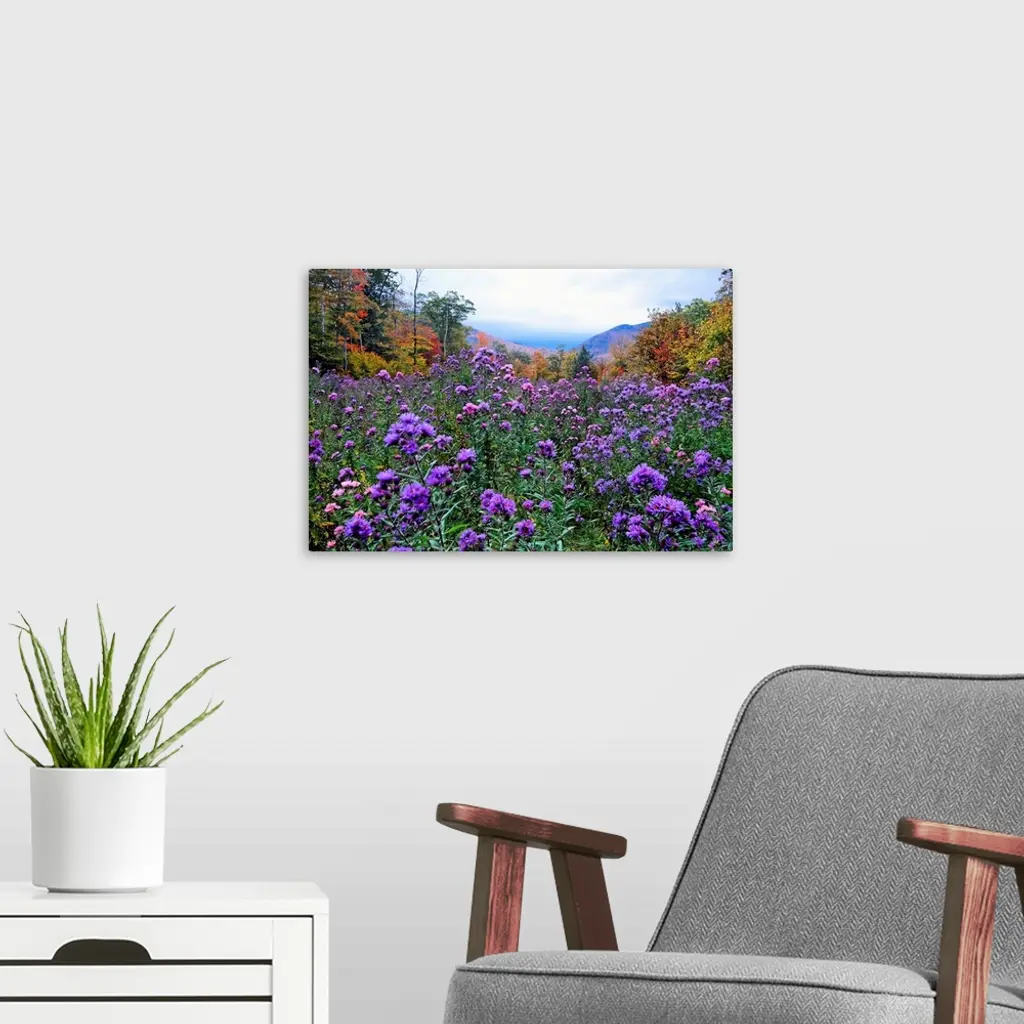 A field of elysian are shown surrounded by a forest and mountain in the distance in fall in this photograph.