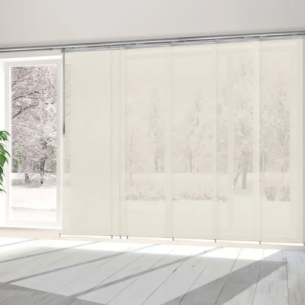 Central Design Products is pleased to introduce a new innovative panel track that offers easy 2-way installation, adding an alluring style and refined touch to your home decor. The single rail design of the track is sleek, compact, and reduces the overall footprint and weight of the installation, eliminating bulky, intrusive window treatments. Adjusting the panel height is a breeze � simply trim the panel, re-attach the liner, and install the panel weight. Detailed instructions are included.The panel track also features a patented slider design, made with aluminum and fitted with bearings that allow for durable and smooth operation. The sliders are stacked closer together than conventional panel tracks, reducing light bleed coming from the gaps between panels. This track has endless uses from dividing rooms, garages, offices, and closets to decorating windows and patios. Available in larger sizes including 8, 10, and 12 panels. Extends from 110-153� wide. Each panel measures 23.5" wide and 91.5" tall, with a total installation height of 94" (includes the 2.5" rail track). The track can be wall or ceiling mounted. The panels can stack on the left or the right. The clearance from the wall is extendable from 1.25� to 3.25� and projection from the wall is extendable from 3� to 4.25�. Elza panel is made from 75% Vinyl 25% Polyester, with a light filtering shade that blocks 40% of the light.