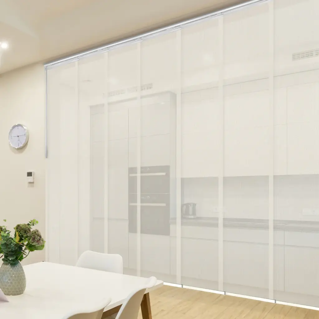 Central Design Products is pleased to introduce a new innovative panel track that offers easy 2-way installation, adding an alluring style and refined touch to your home decor. The single rail design of the track is sleek, compact, and reduces the overall footprint and weight of the installation, eliminating bulky, intrusive window treatments. Adjusting the panel height is a breeze � simply trim the panel, re-attach the liner, and install the panel weight. Detailed instructions are included.The panel track also features a patented slider design, made with aluminum and fitted with bearings that allow for durable and smooth operation. The sliders are stacked closer together than conventional panel tracks, reducing light bleed coming from the gaps between panels. This track has endless uses from dividing rooms, garages, offices, and closets to decorating windows and patios. Available in larger sizes including 8, 10, and 12 panels. Extends from 110-153� wide. Each panel measures 23.5" wide and 116" tall, with a total installation height of 118.5" (includes the 2.5" rail track). The track can be wall or ceiling mounted. The panels can stack on the left or the right. The clearance from the wall is extendable from 1.25� to 3.25� and projection from the wall is extendable from 3� to 4.25�. Elza panel is made from 75% Vinyl 25% Polyester, with a light filtering shade that blocks 40% of the light.