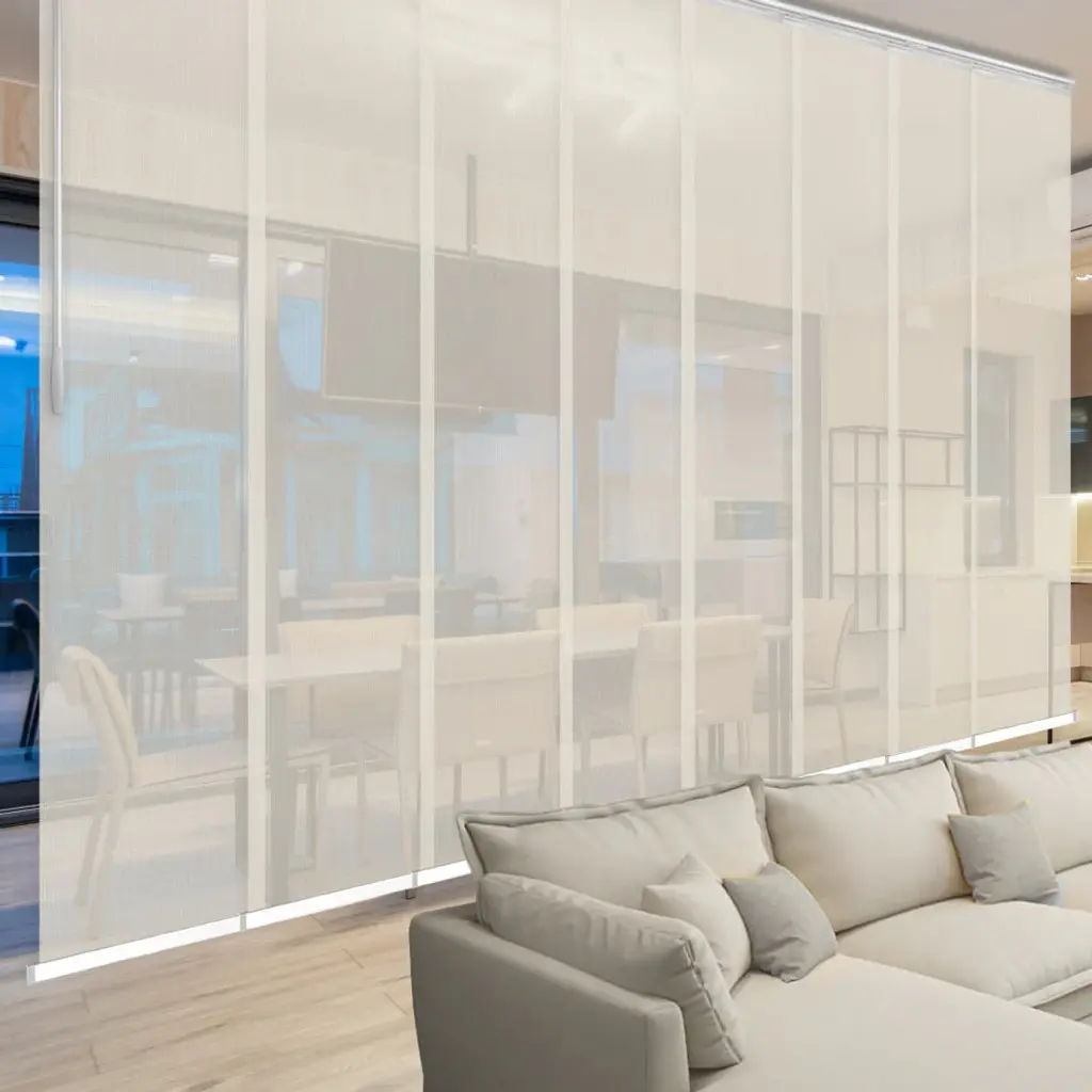 Central Design Products is pleased to introduce a new innovative panel track that offers easy 2-way installation, adding an alluring style and refined touch to your home decor. The double rail design of the track is sleek, compact, and reduces the overall footprint and weight of the installation, eliminating bulky, intrusive window treatments. Adjusting the panel height is a breeze � simply trim the panel, re-attach the liner, and install the panel weight. Detailed instructions are included.The panel track also features a patented slider design, made with aluminum and fitted with bearings that allow for durable and smooth operation. The sliders are stacked closer together than conventional panel tracks, reducing light bleed coming from the gaps between panels. This track has endless uses from dividing rooms, garages, offices, and closets to decorating windows and patios. Available in smaller sizes including 3, 4, 5, 6, and 7 panels. Extends from 130-175� wide. Each panel measures 23.5" wide and 116" tall, with a total installation height of 118.5" (includes the 2.5" rail track). The track can be wall or ceiling mounted. The panels can stack on the left or the right. The clearance from the wall is extendable from 1.25� to 3.25� and projection from the wall is extendable from 3� to 4.25�. Elza panel is made from 75% Vinyl 25% Polyester, with a light filtering shade that blocks 40% of the light.