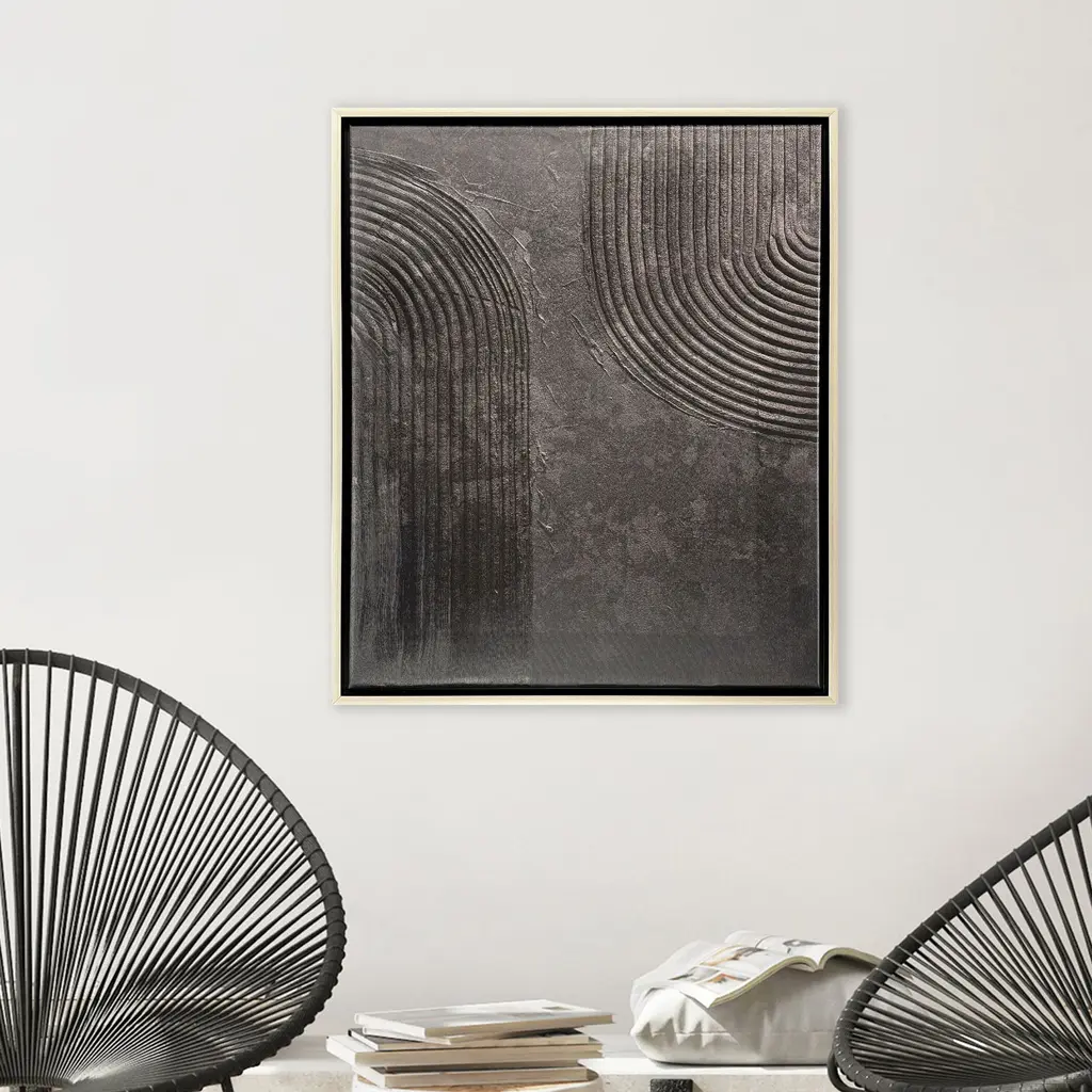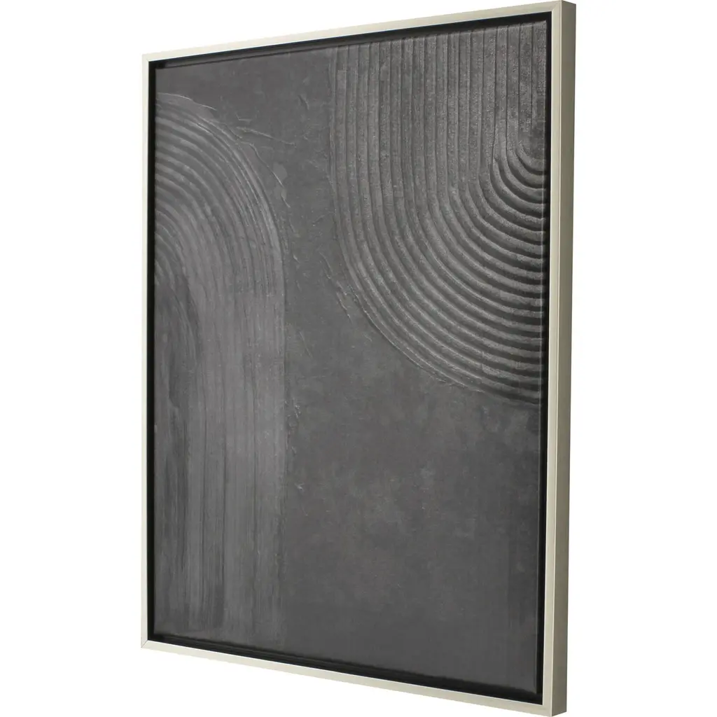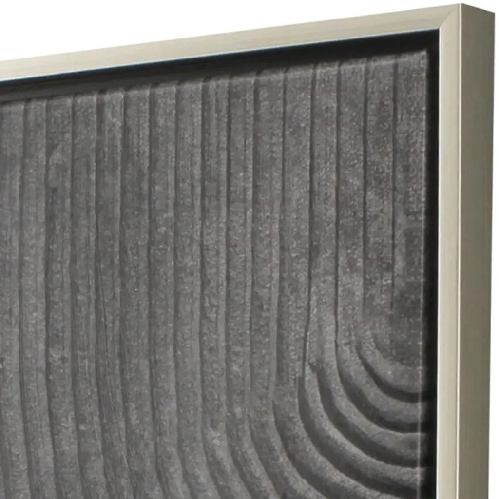 Abstract art with linear designs is accented with a hand applied enhanced gel finish. Canvas is mounted in a brushed silver finish floater frame.