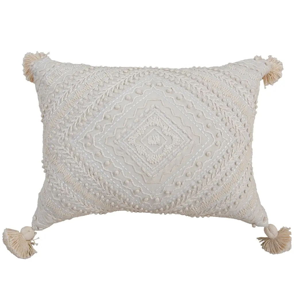 This pillow is an embroidered work of art. Hand guided machine and hand embroidered techniques meet to create a crafted work that will be center stage in any home where art and needlecrafts are celebrated. Hand tied French Knots accent these other embroidery styles. Four corner tassels- hand made and tied, finish this pillow in pommed fashion. the back of this pillow is a solid cotton duck with a hidden zippered closure for ease of fill.