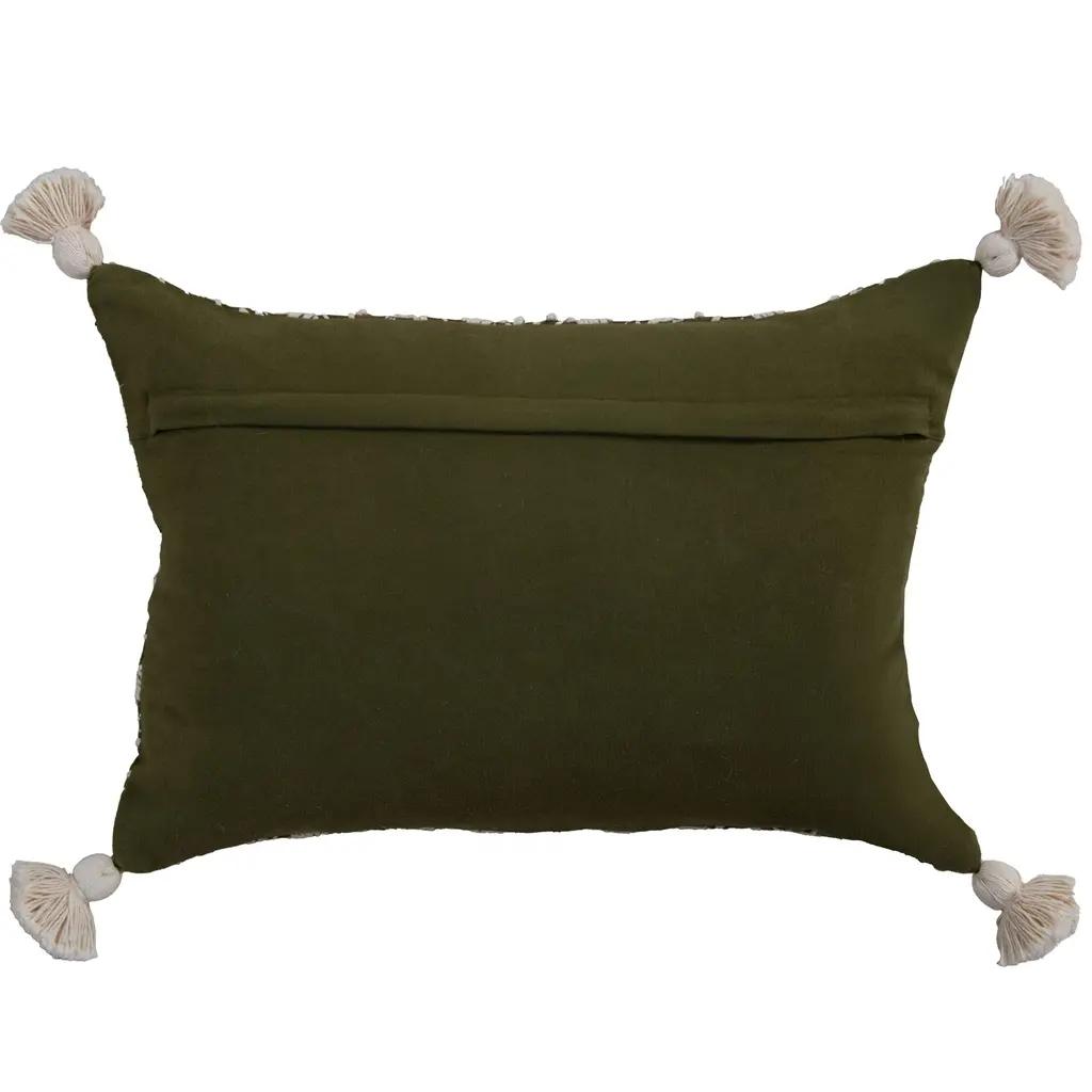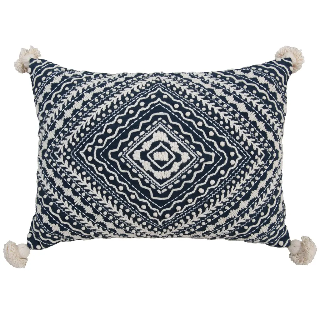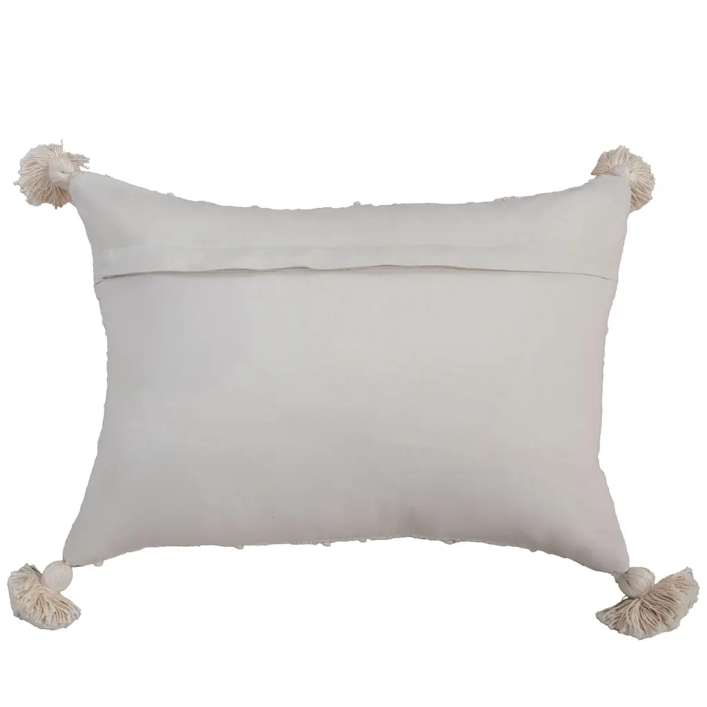 This pillow is an embroidered work of art. Hand guided machine and hand embroidered techniques meet to create a crafted work that will be center stage in any home where art and needlecrafts are celebrated. Hand tied French Knots accent these other embroidery styles. Four corner tassels- hand made and tied, finish this pillow in pommed fashion. the back of this pillow is a solid cotton duck with a hidden zippered closure for ease of fill.