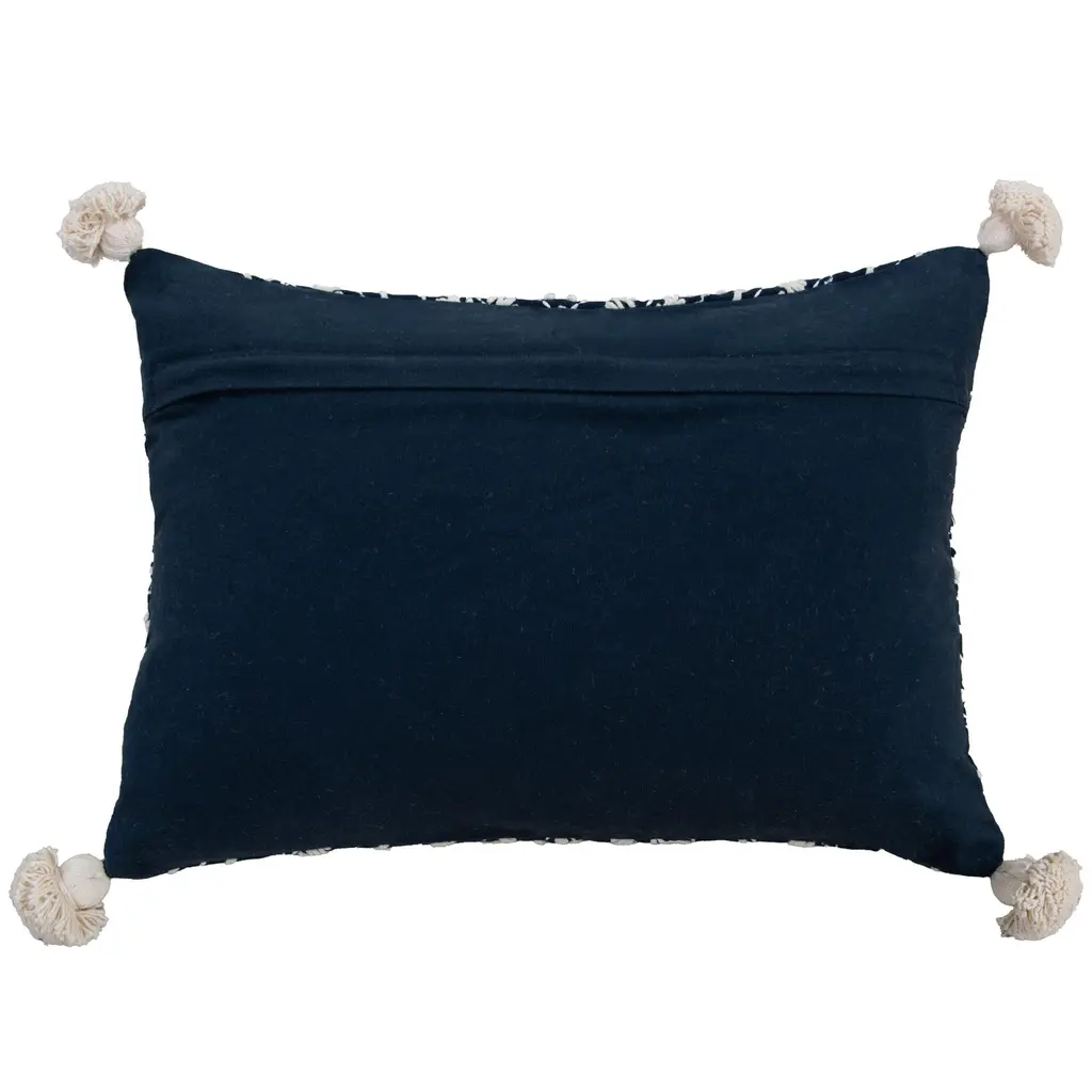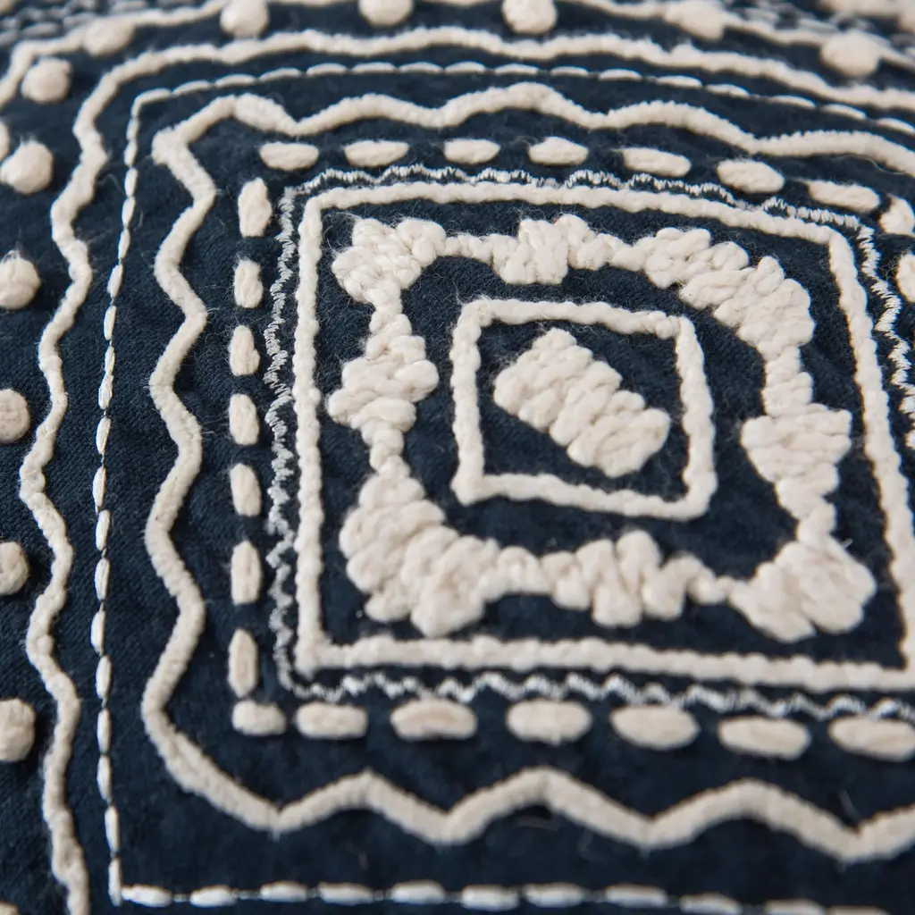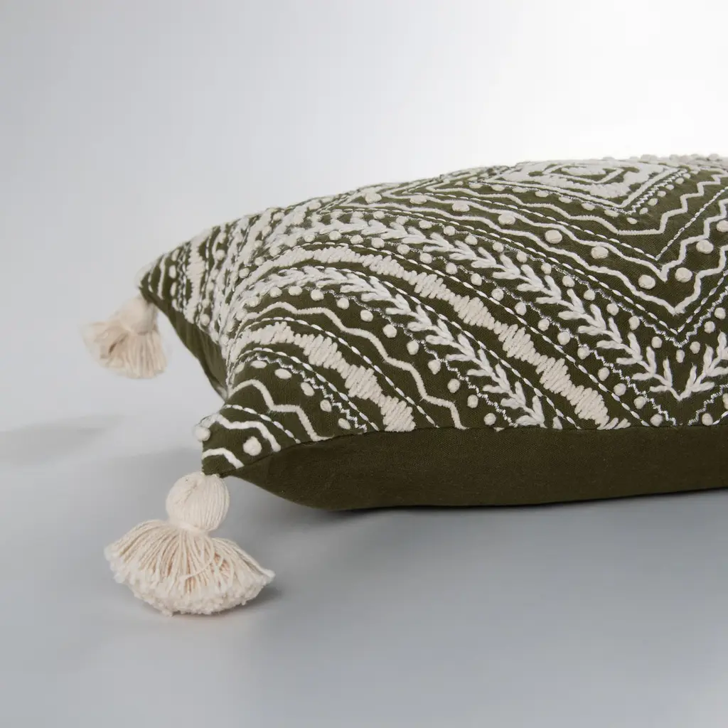 This pillow is an embroidered work of art. Hand guided machine and hand embroidered techniques meet to create a crafted work that will be center stage in any home where art and needlecrafts are celebrated. Hand tied French Knots accent these other embroidery styles. Four corner tassels- hand made and tied, finish this pillow in pommed fashion. the back of this pillow is a solid cotton duck with a hidden zippered closure for ease of fill.