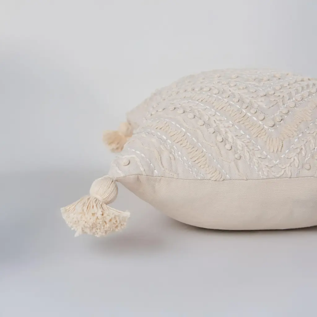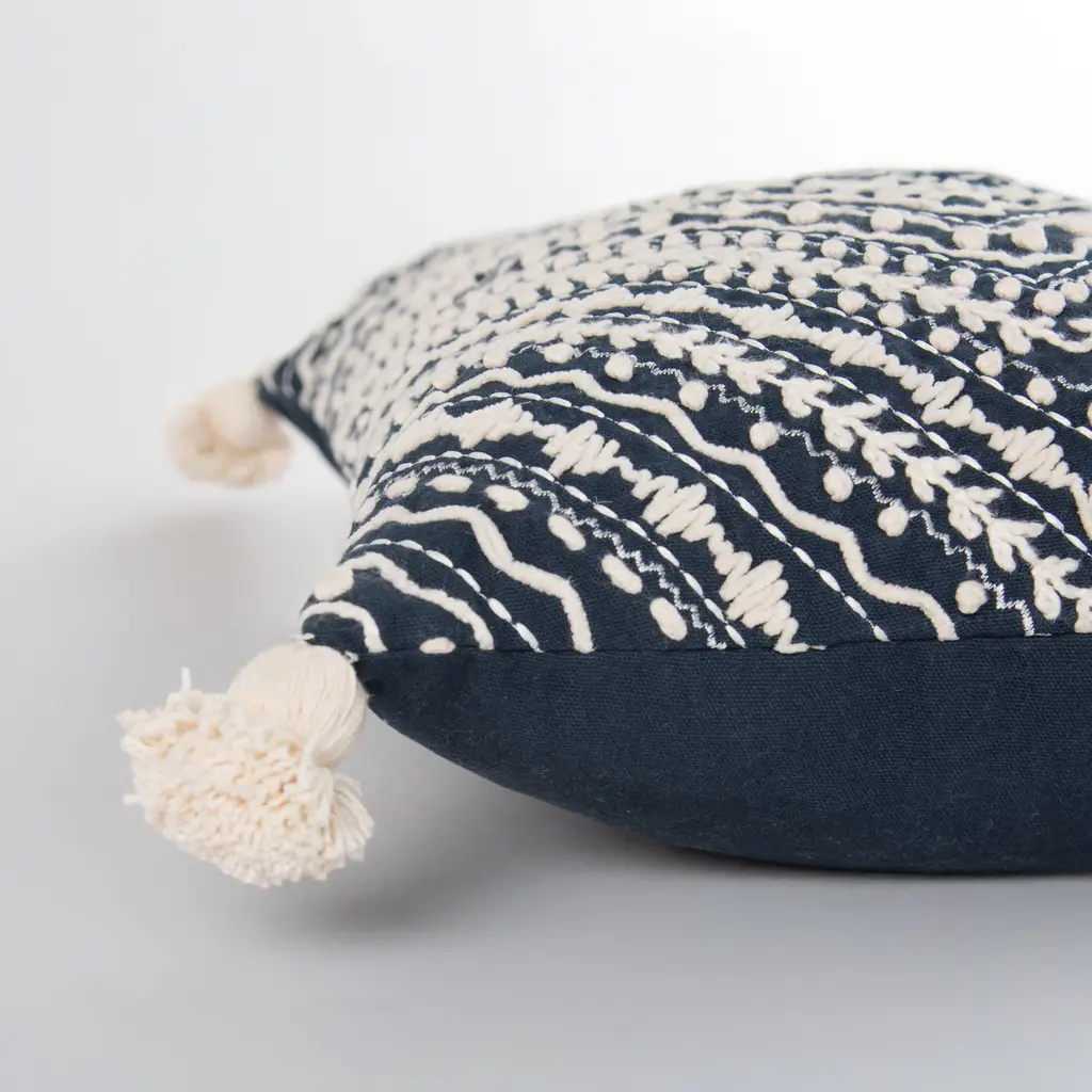 This pillow is an embroidered work of art. Hand guided machine and hand embroidered techniques meet to create a crafted work that will be center stage in any home where art and needlecrafts are celebrated. Hand tied French Knots accent these other embroidery styles. Four corner tassels- hand made and tied, finish this pillow in pommed fashion. the back of this pillow is a solid cotton duck with a hidden zippered closure for ease of fill.