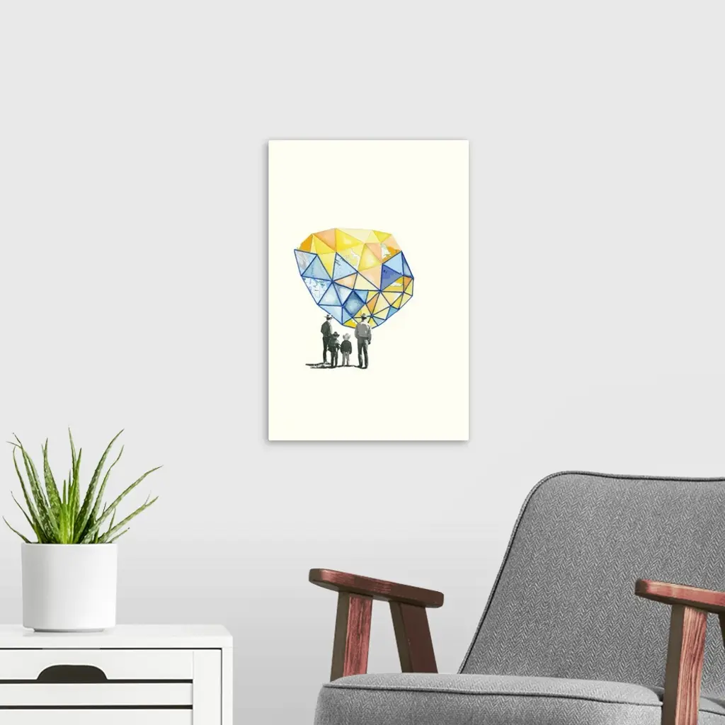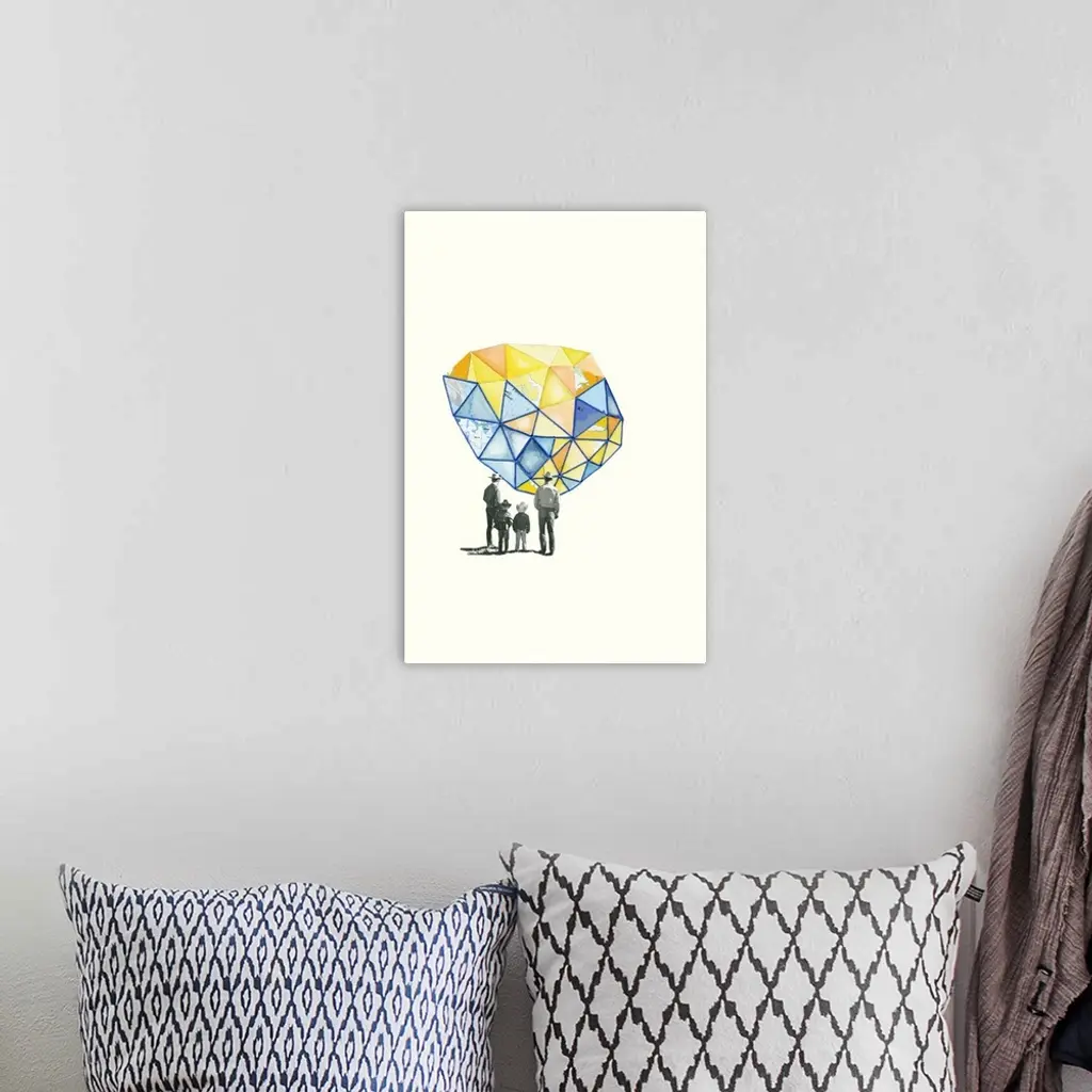 Abstract art of a geometric prism created with mixed media in shades of yellow and blue with map pieces and a group of cowboys in the foreground.