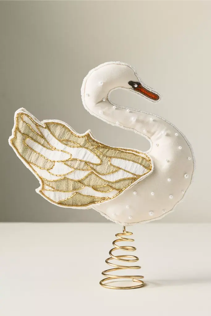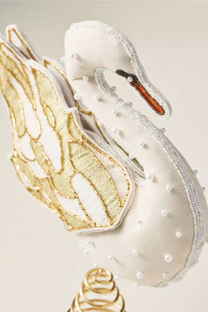 **Treat your tree this holiday season!** This hand-embroidered swan topper makes for a festive finishing touch