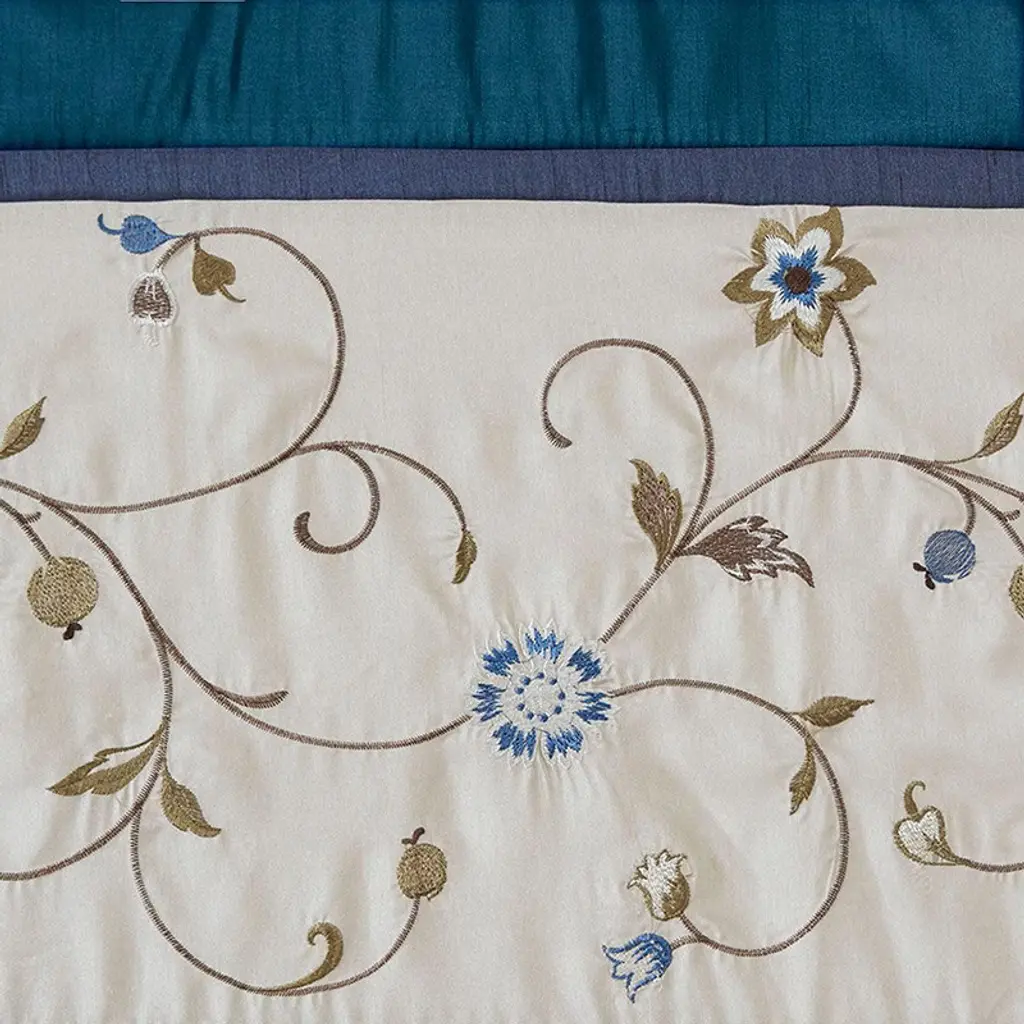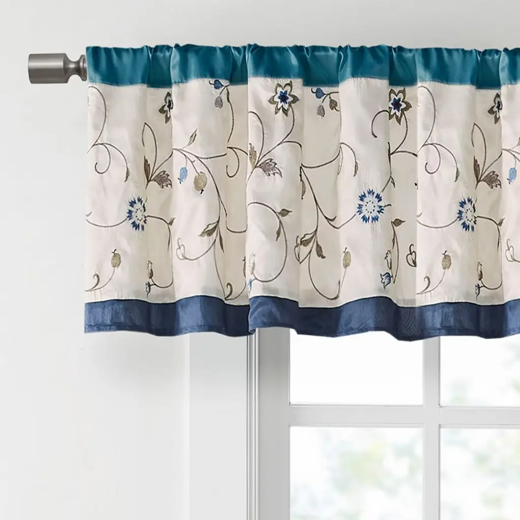 Description Add simple elegance to any room with the Serene window valance. The deep navy color combined with soft ivory and chocolate brown creates the perfect classic look. The valance features delicate floral embroidery and lining to help filter light and provide some room darkening features. Valance is made with 3" rod pocket and fits up to 1.25" diameter rod. Product Details 50x18" 1 Valance:50x18" Material 100% Polyester